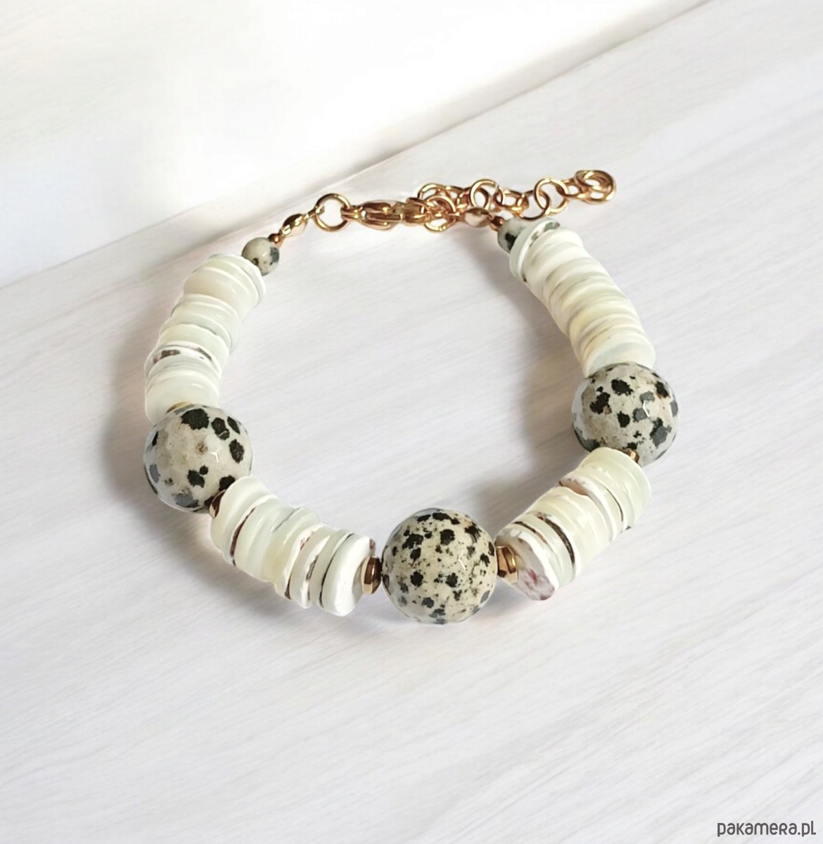 Bransoletka wykonana z nieregularnych plastrów kremowej muszli oraz kul jaspisu dalmatyńskiego (duże, fasetowane kule 12mm) oddzielonych od siebie przekładkami ze złotego hematytu.