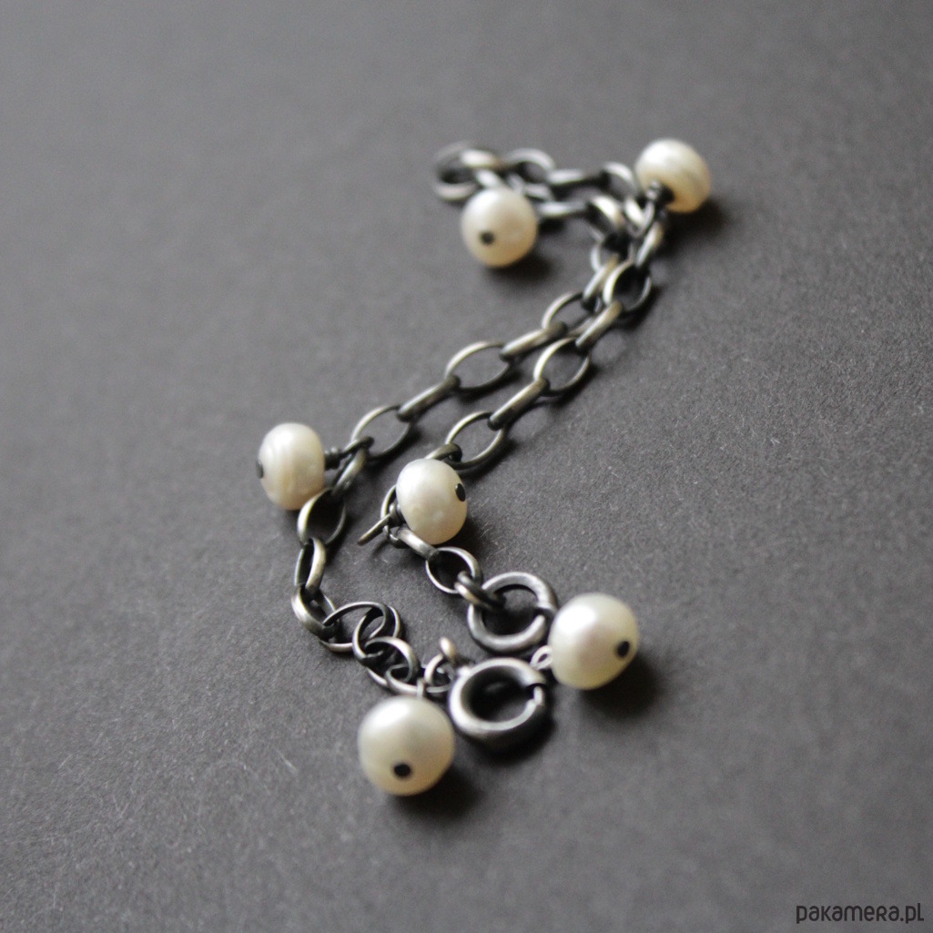 Bransoletka wykonana została z oksydowanego srebra próby 925 oraz perełek naturalnych hodowlanych wielkości 0,7 cm