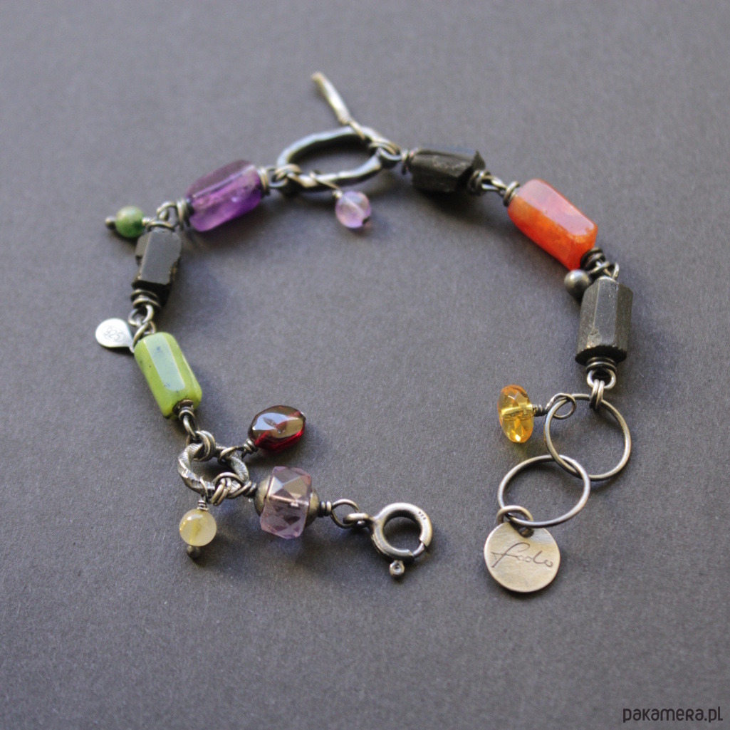 Bransoletka UNIKAT wykonana została z oksydowanego srebra próby 925 oraz minerałów: