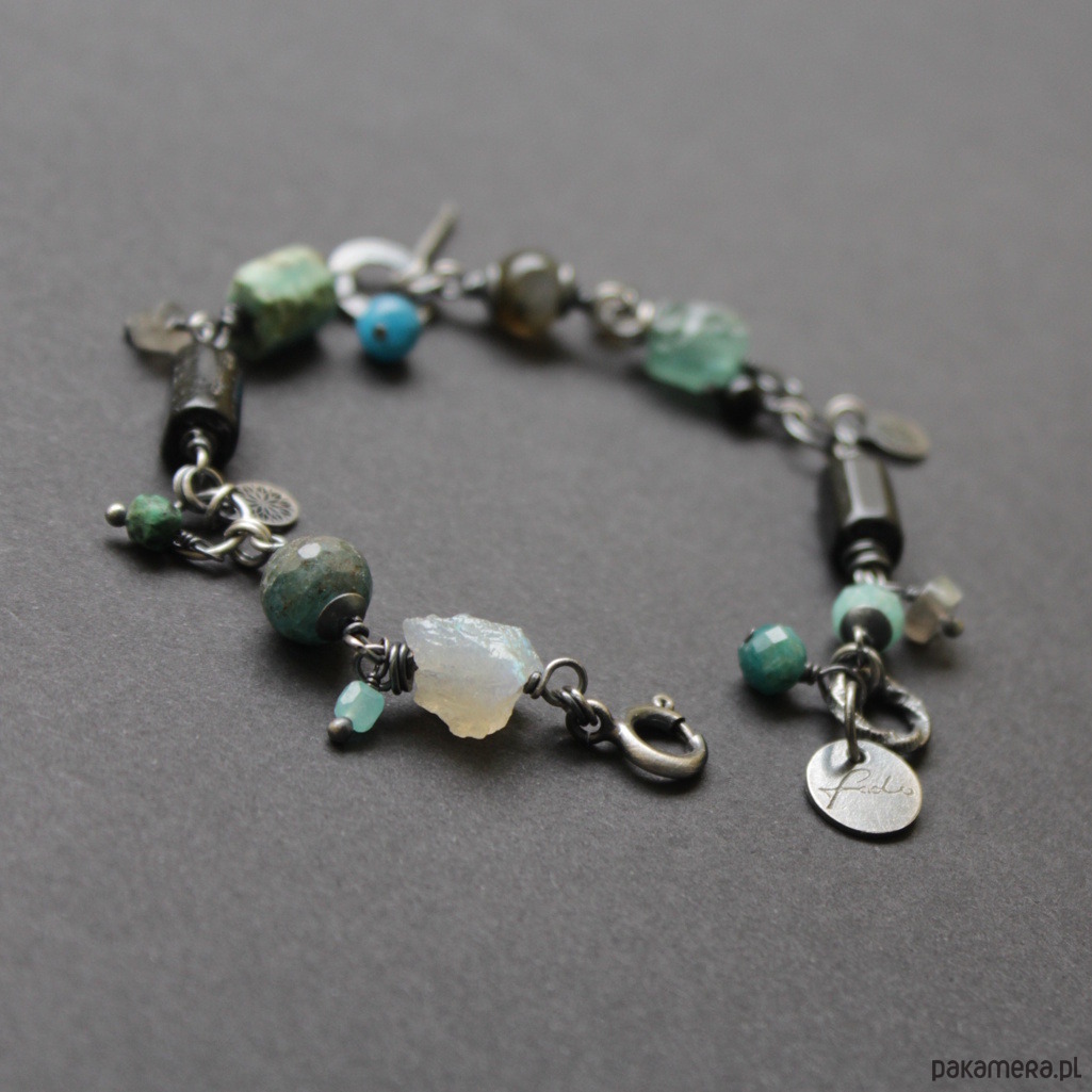 Bransoletka UNIKAT wykonana została z oksydowanego srebra próby 925 oraz minerałów: