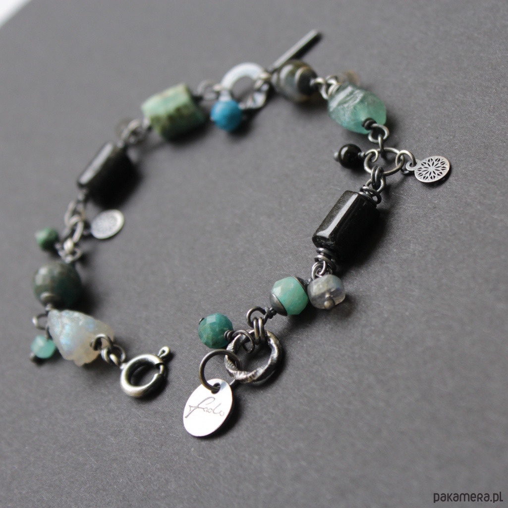 Bransoletka UNIKAT wykonana została z oksydowanego srebra próby 925 oraz minerałów: