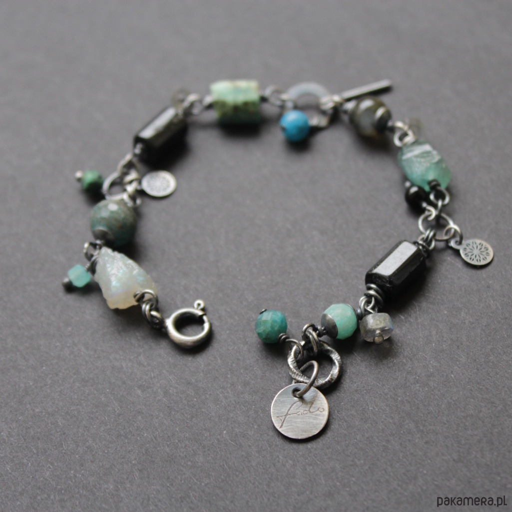 Bransoletka UNIKAT wykonana została z oksydowanego srebra próby 925 oraz minerałów: