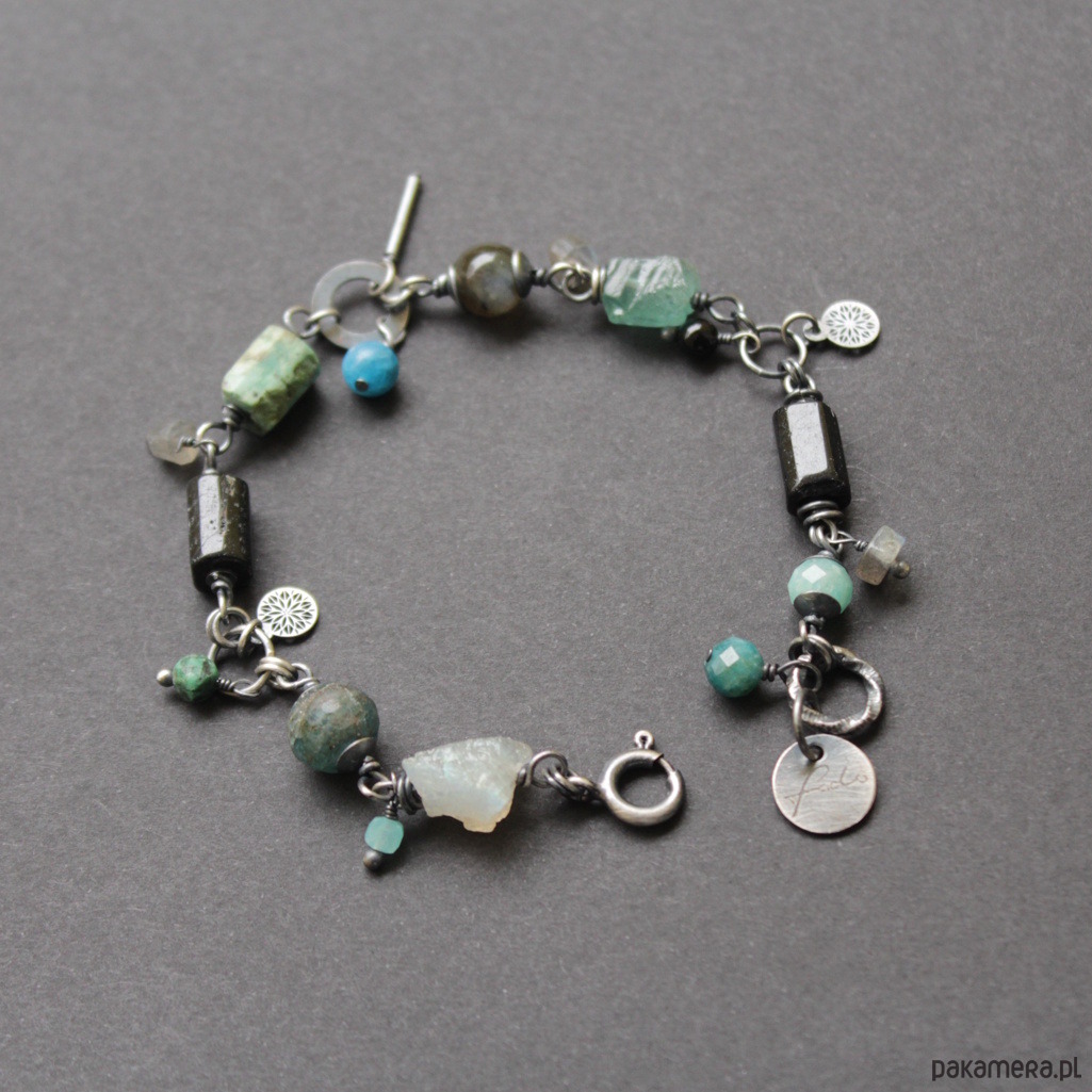 Bransoletka UNIKAT wykonana została z oksydowanego srebra próby 925 oraz minerałów: