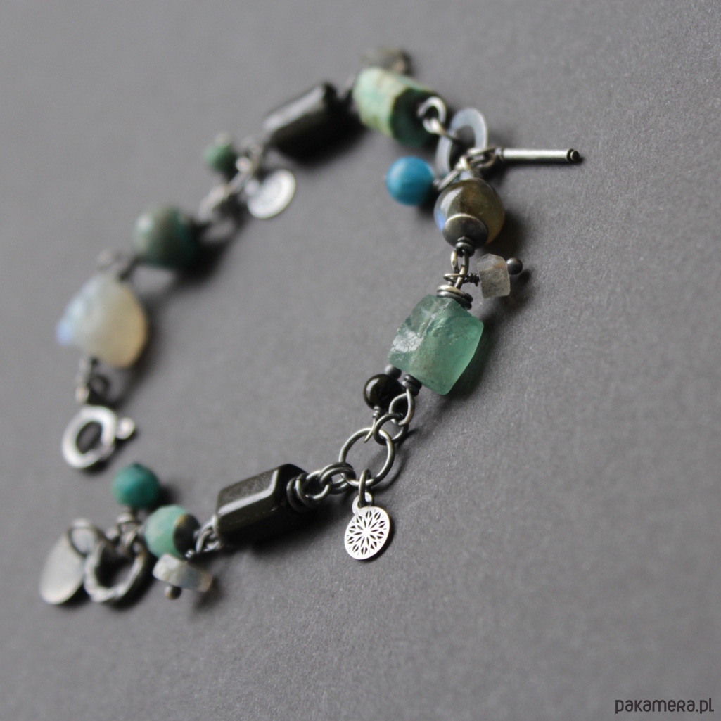 Bransoletka UNIKAT wykonana została z oksydowanego srebra próby 925 oraz minerałów: