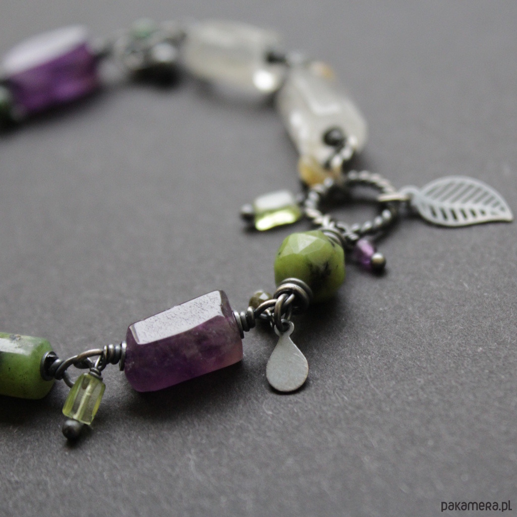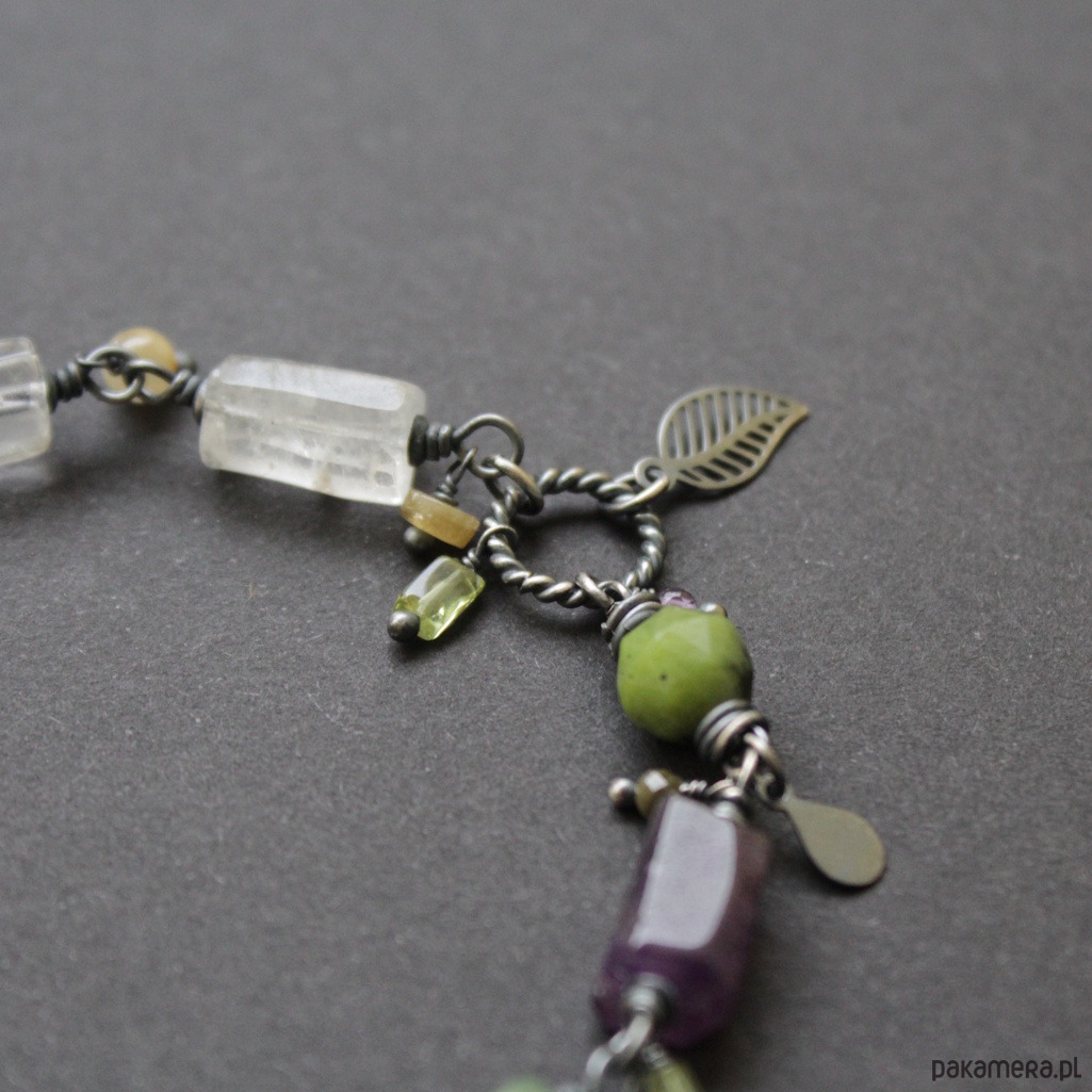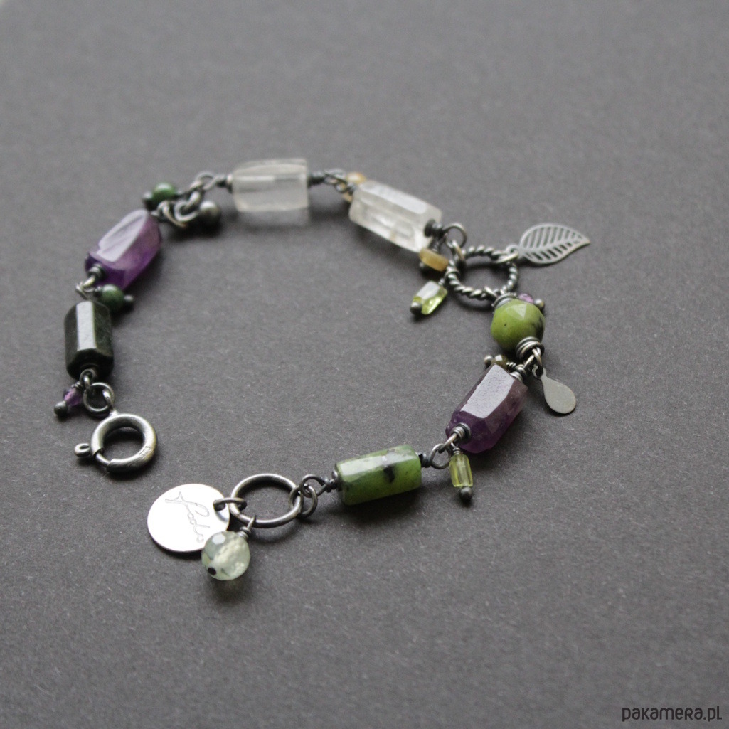 Bransoletka UNIKAT wykonana została z oksydowanego srebra próby 925 oraz minerałów: