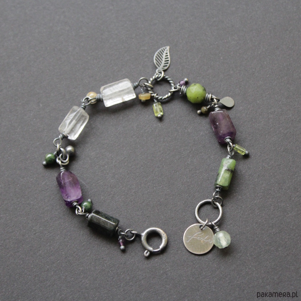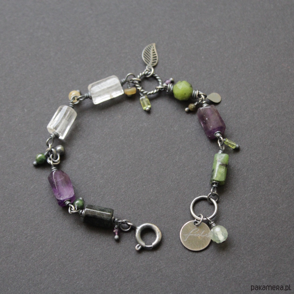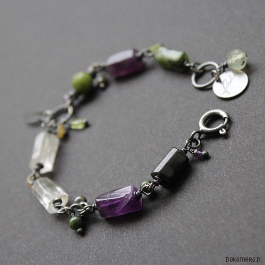 Bransoletka UNIKAT wykonana została z oksydowanego srebra próby 925 oraz minerałów: