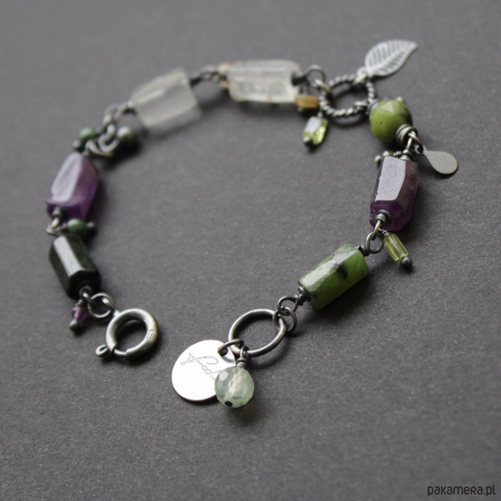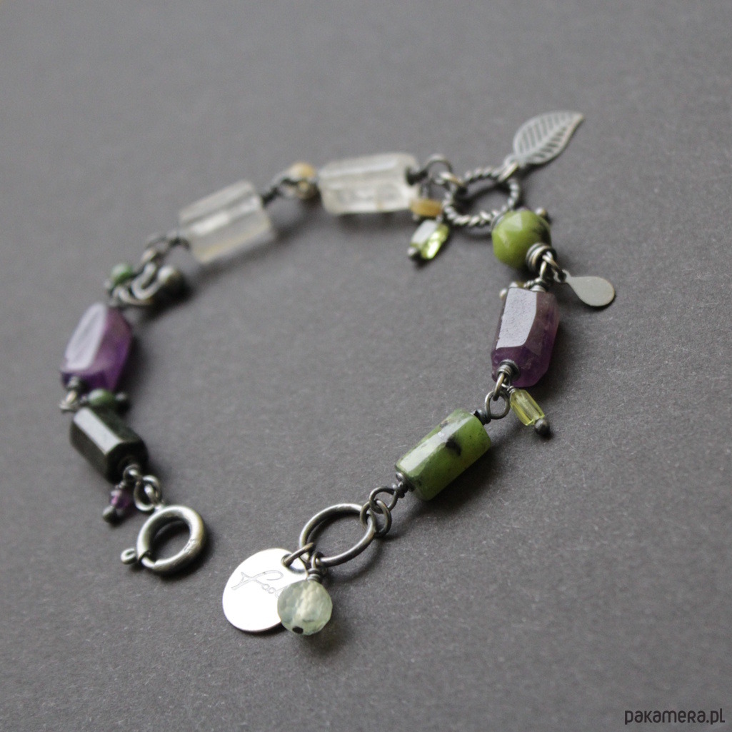 Bransoletka UNIKAT wykonana została z oksydowanego srebra próby 925 oraz minerałów: