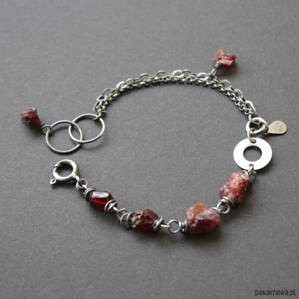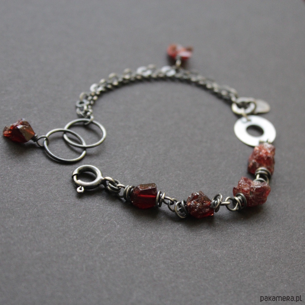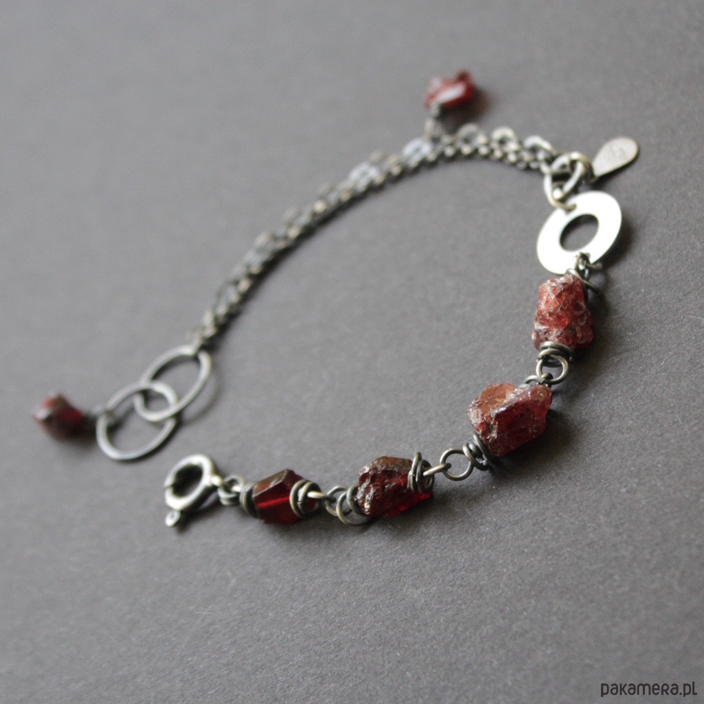 Bransoletka UNIKAT wykonana została z oksydowanego srebra próby 925 oraz surowych bryłek granatów wielkości 0,4-0,7 cm.