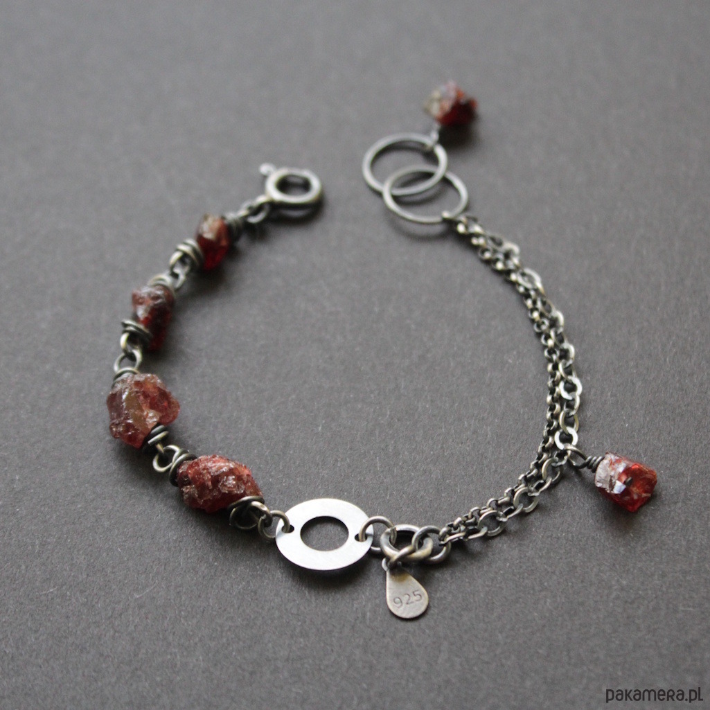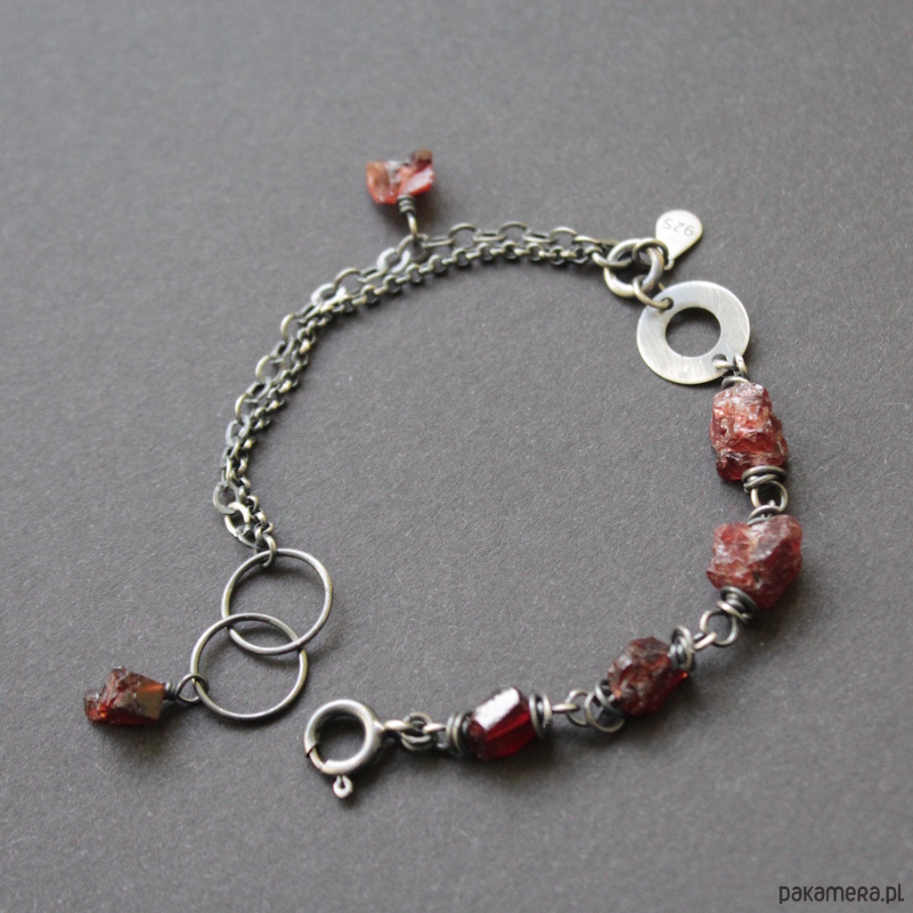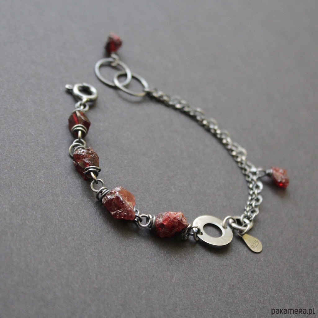 Bransoletka UNIKAT wykonana została z oksydowanego srebra próby 925 oraz surowych bryłek granatów wielkości 0,4-0,7 cm.