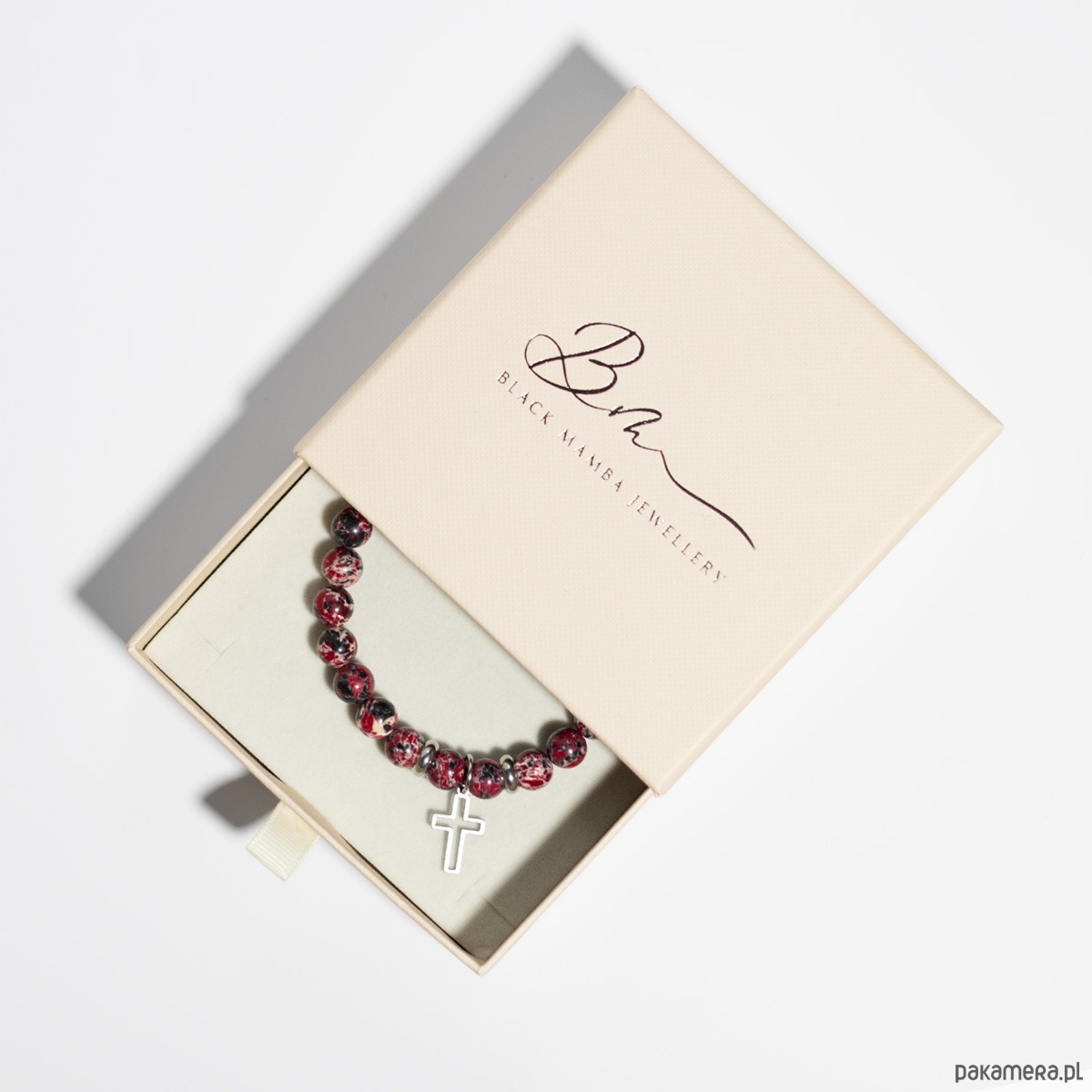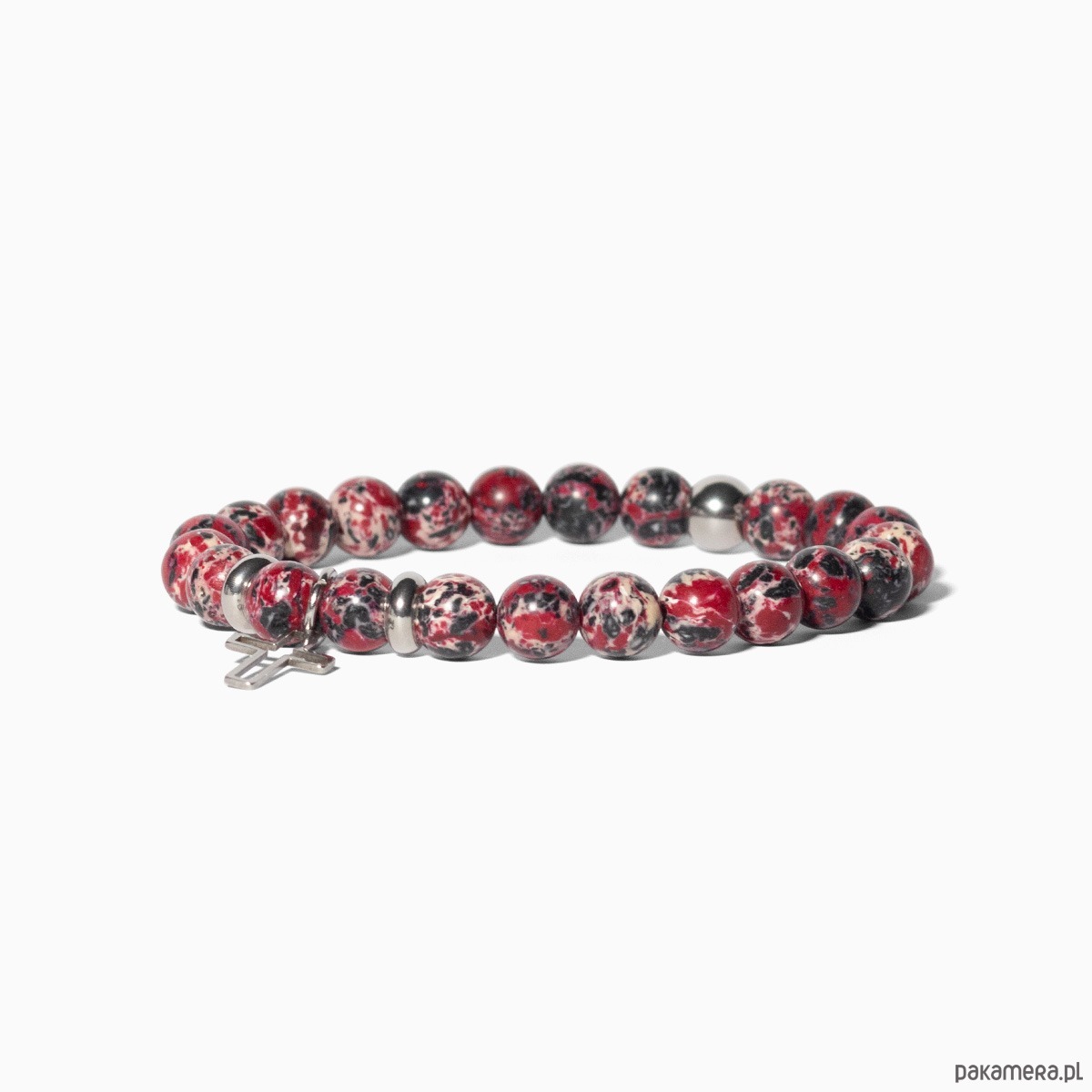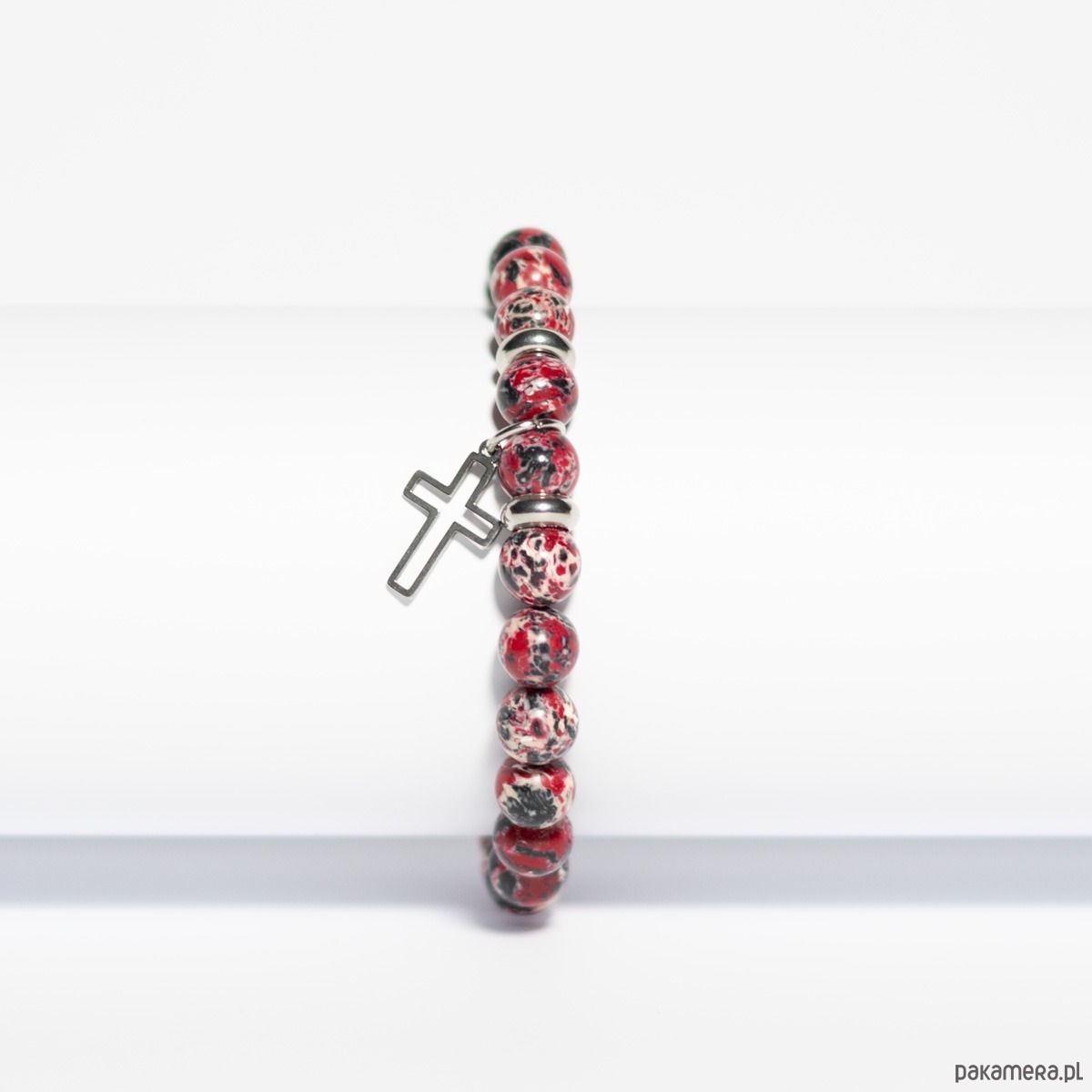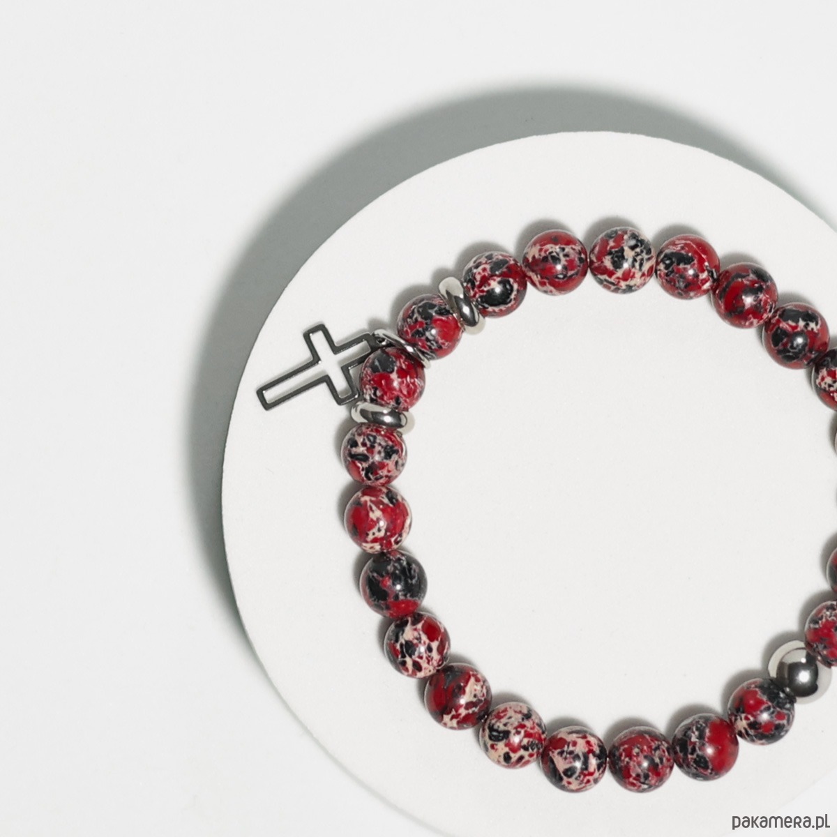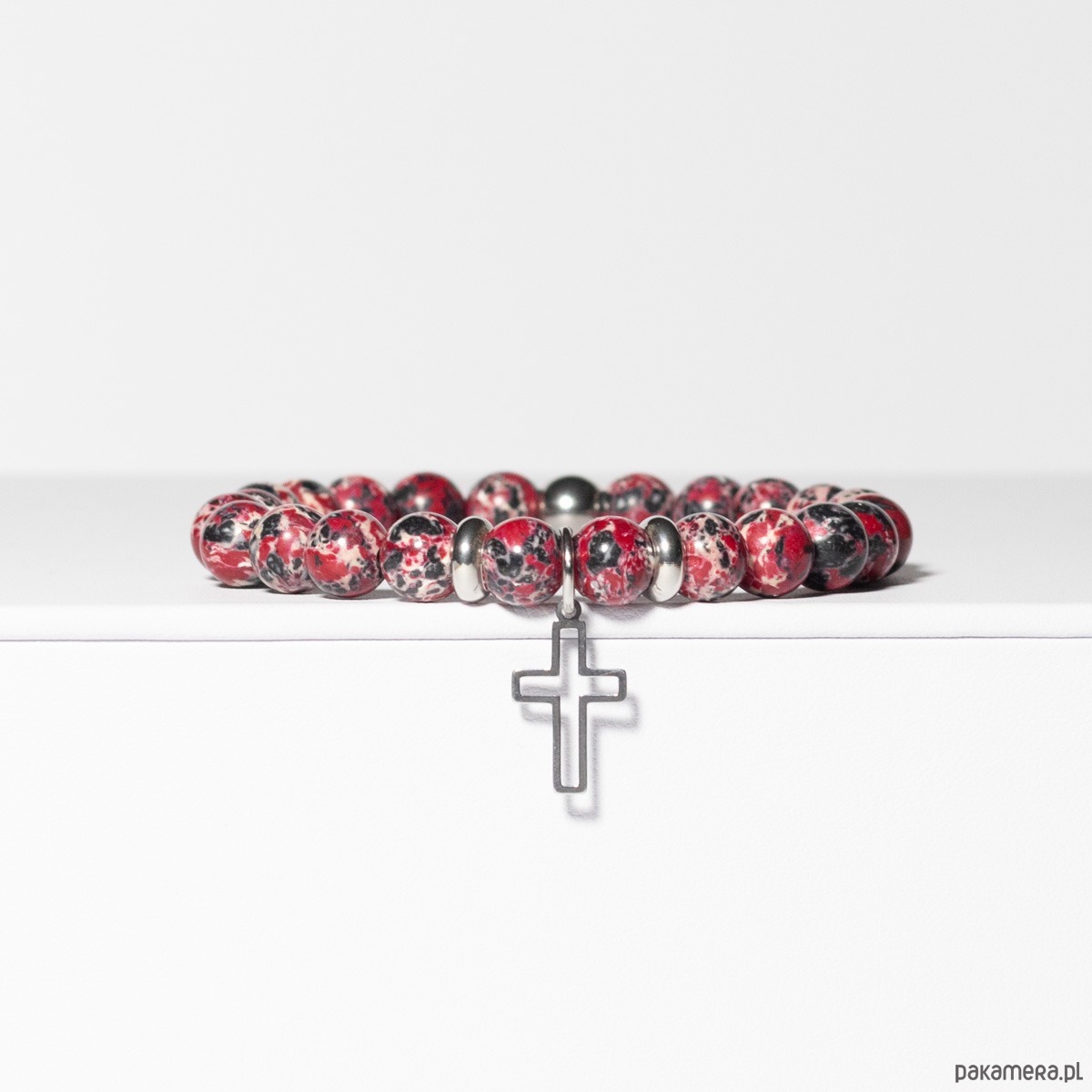 W centrum tej kompozycji znajduje się krzyżyk ze stali szlachetnej 316L, subtelny, lecz wyrazisty symbol duchowej siły. Otoczony przez połyskujące kulki jaspisu i metaliczne akcenty, tworzy harmonijną całość, idealnie łącząc klasykę z nowoczesnością. Stal chirurgiczna 316L jest odporna na zarysowania i utratę blasku, dzięki czemu Twoja bransoletka pozostanie piękna przez lata.