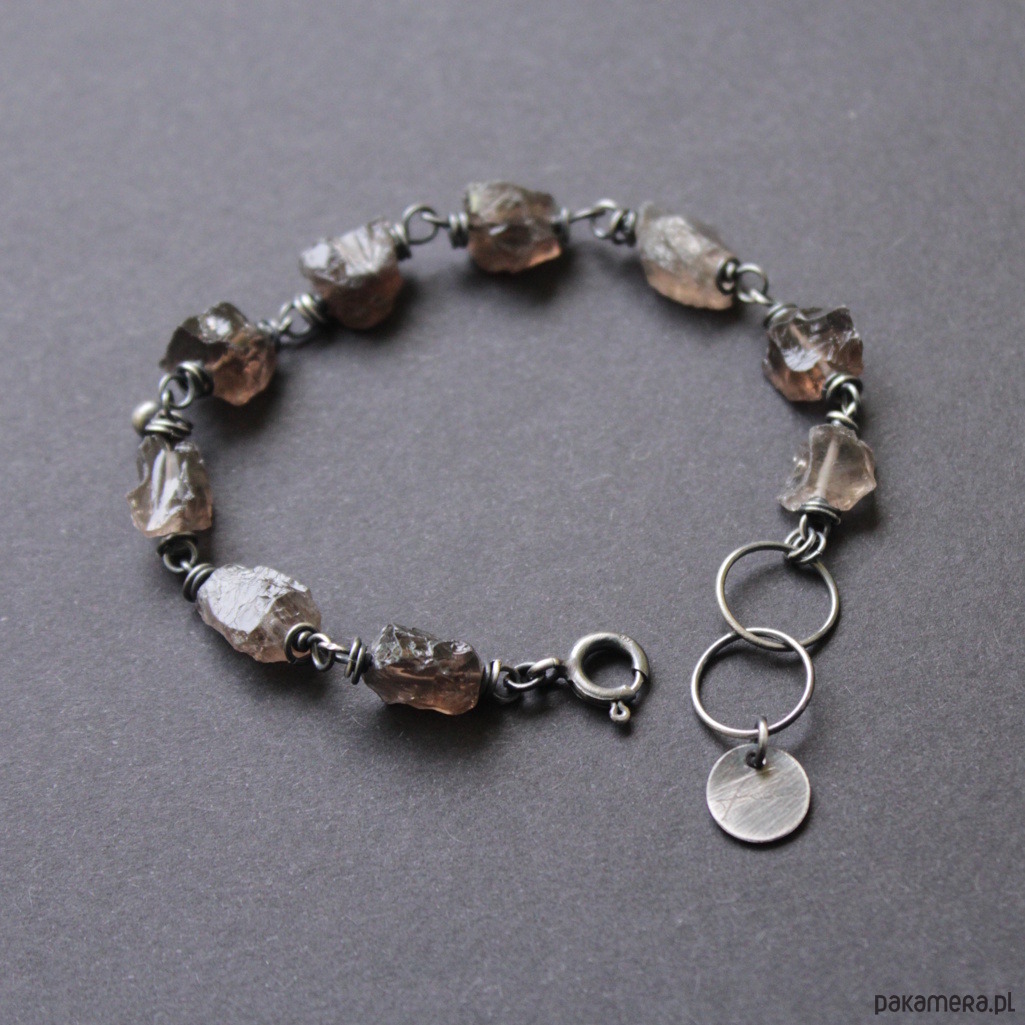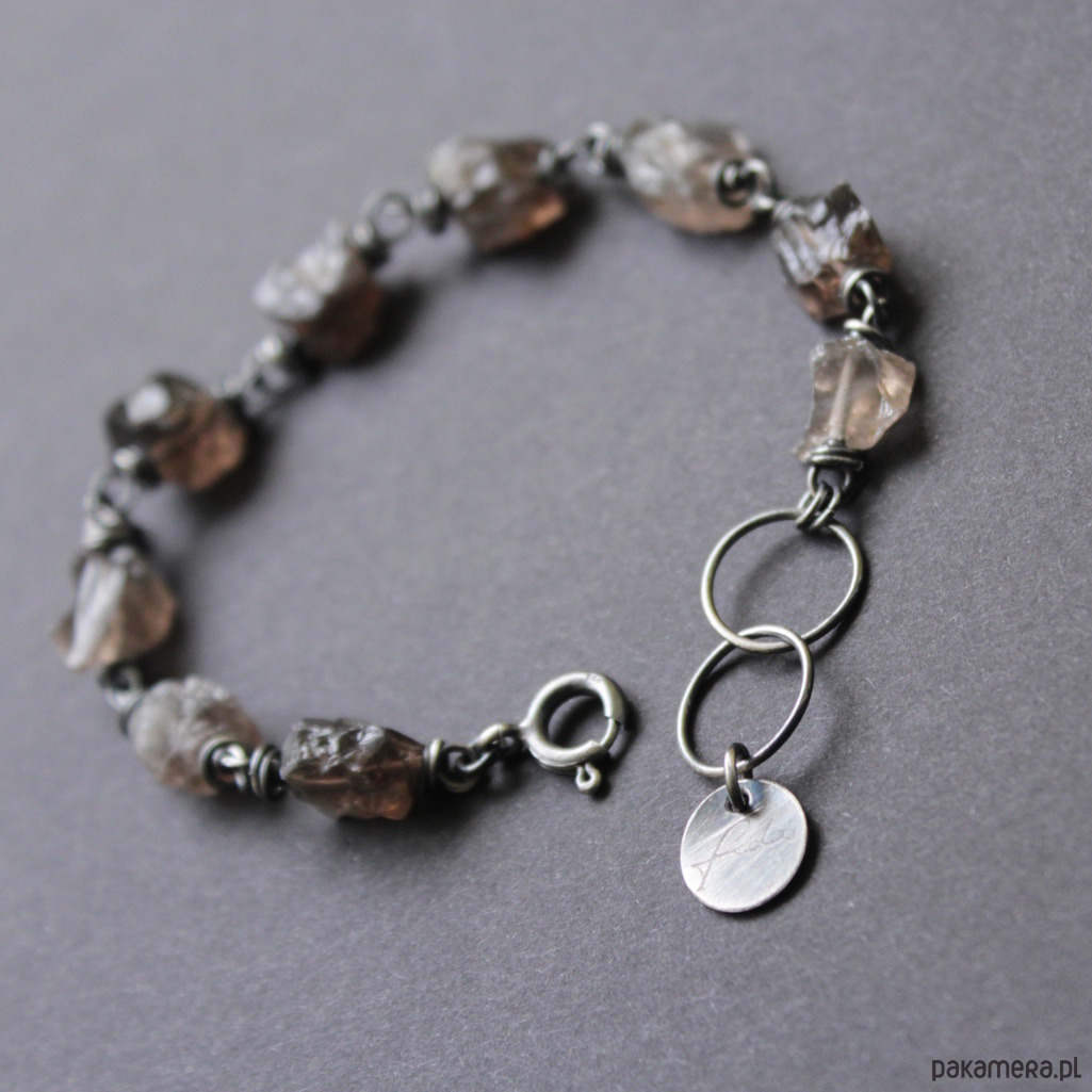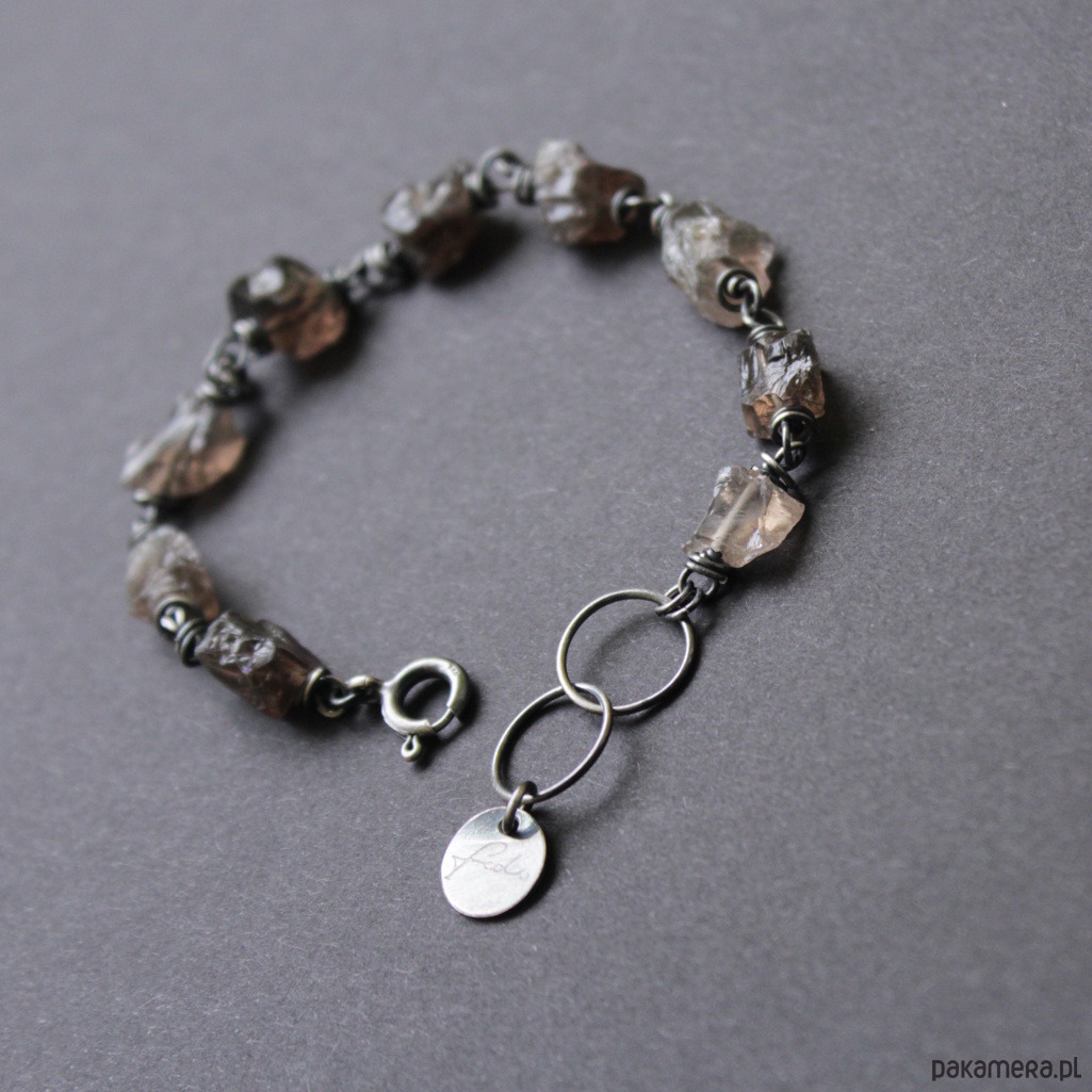 Bransoletka UNIKAT wykonana została z oksydowanego srebra próby 925 oraz surowych bryłek kwarców dymnych wielkości 0,7-0,9 cm.