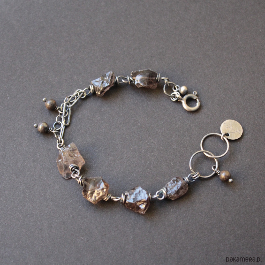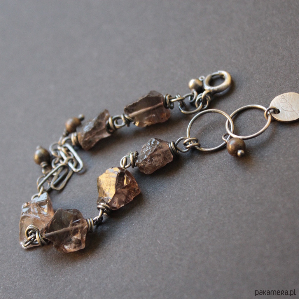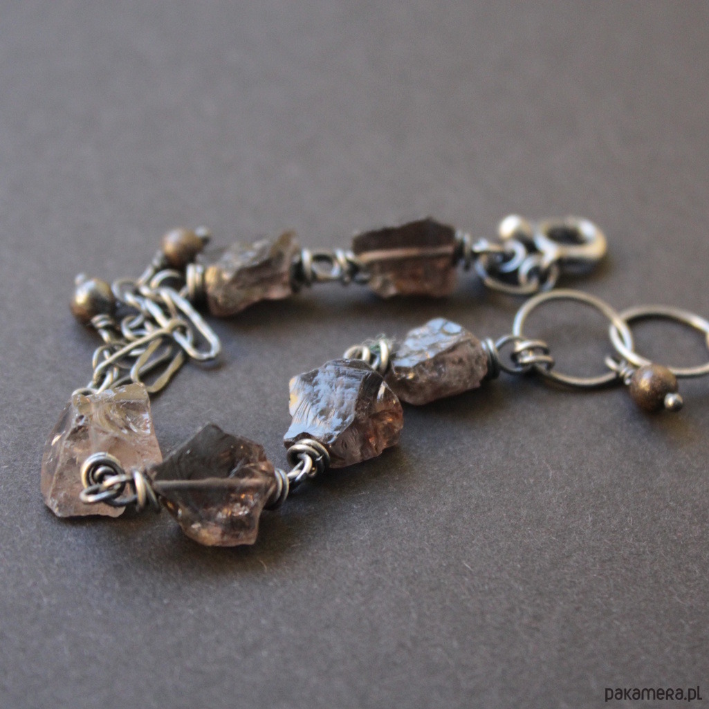 Bransoletka UNIKAT wykonana została z oksydowanego srebra próby 925 oraz surowych bryłek kwarców dymnych wielkości 0,6-0,9 cm.