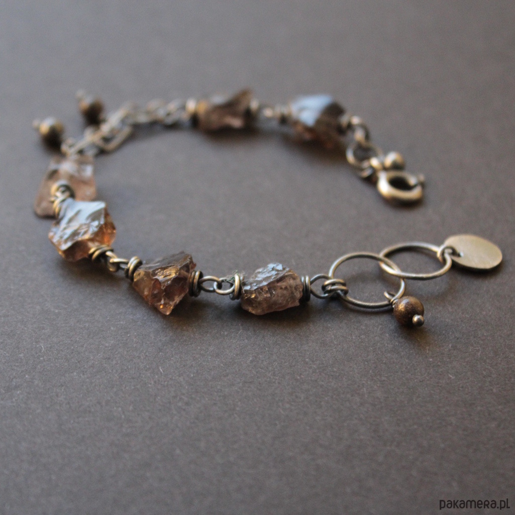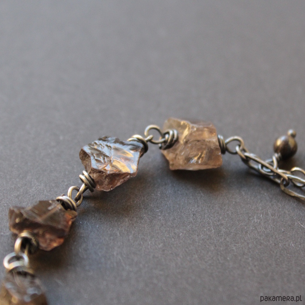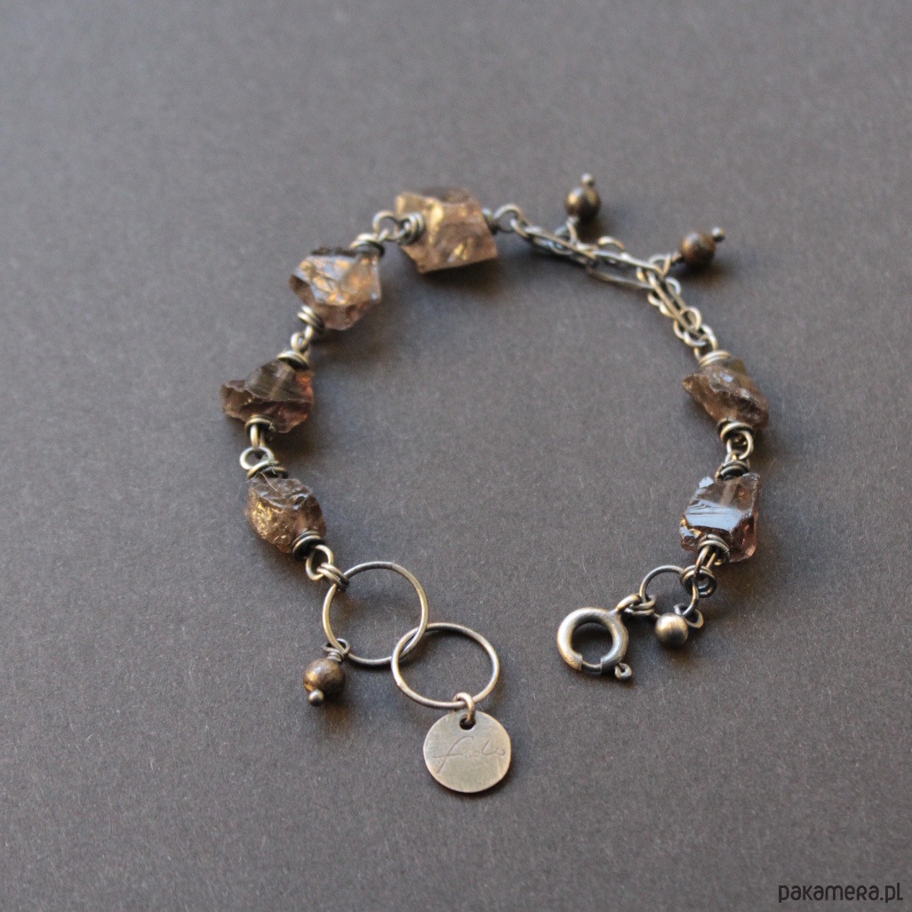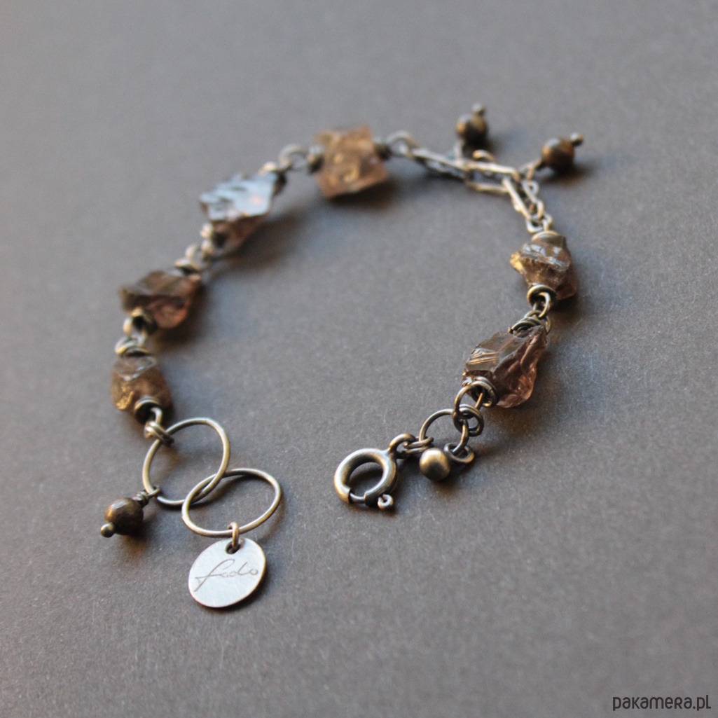 Bransoletka UNIKAT wykonana została z oksydowanego srebra próby 925 oraz surowych bryłek kwarców dymnych wielkości 0,6-0,9 cm.