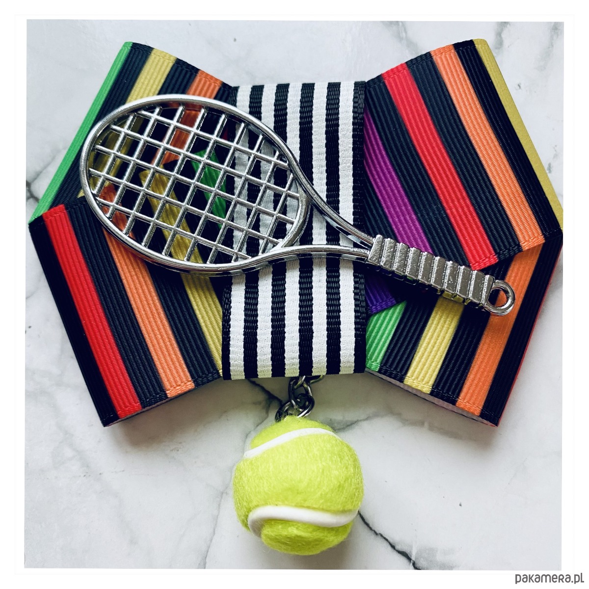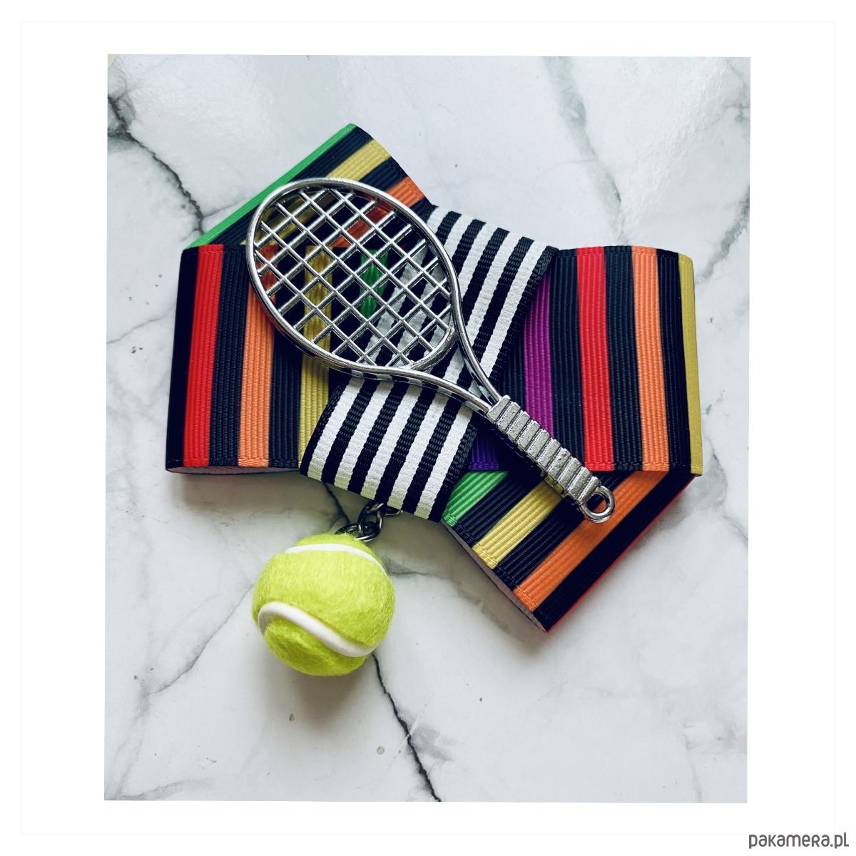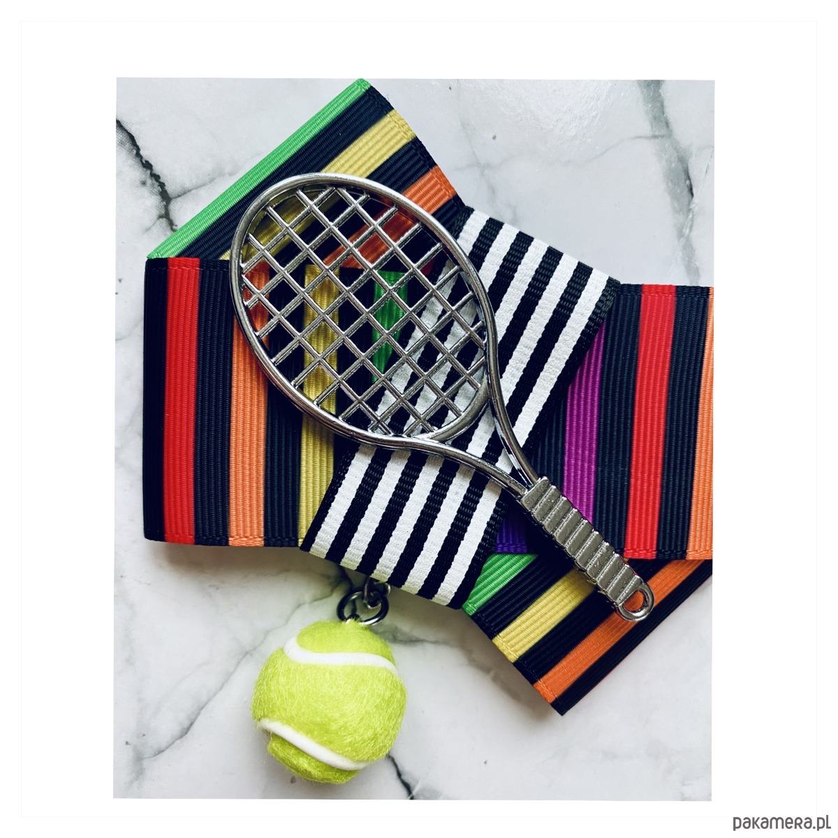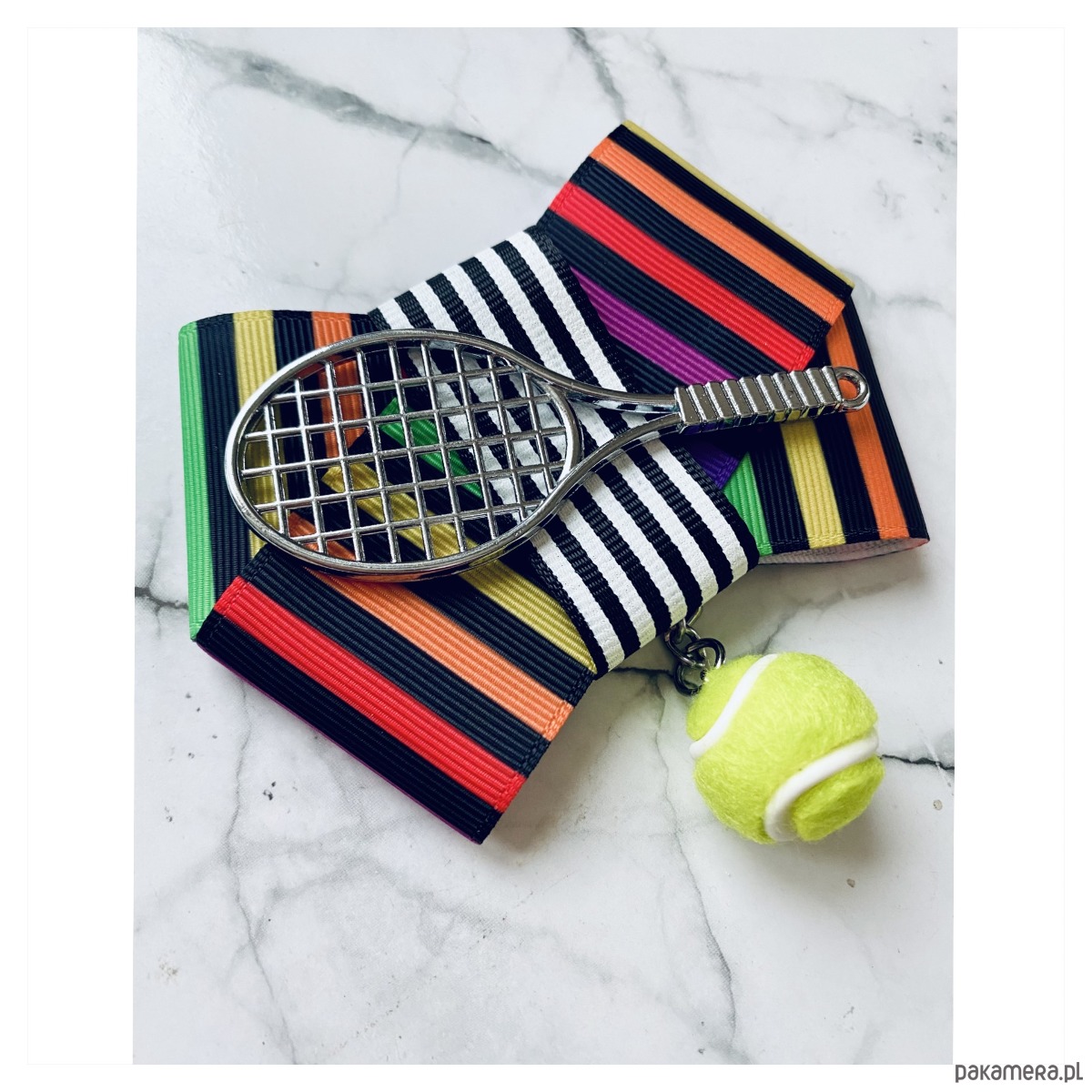 Piękna Sportowa ozdoba na środku, rakieta tenisowa wraz z wiszącą piłką.