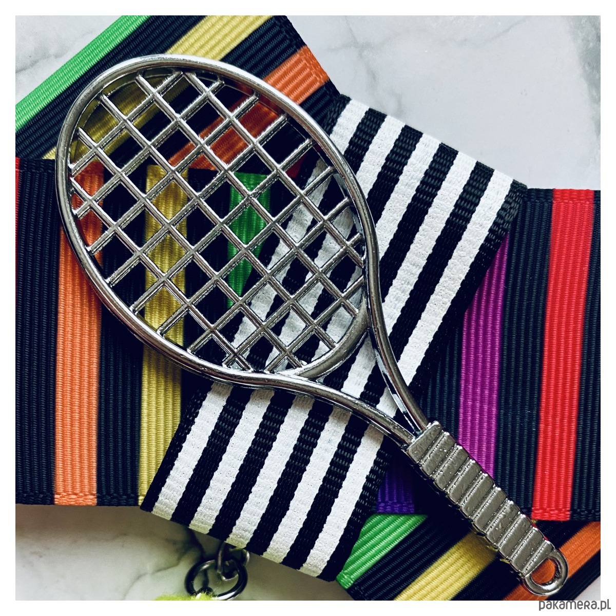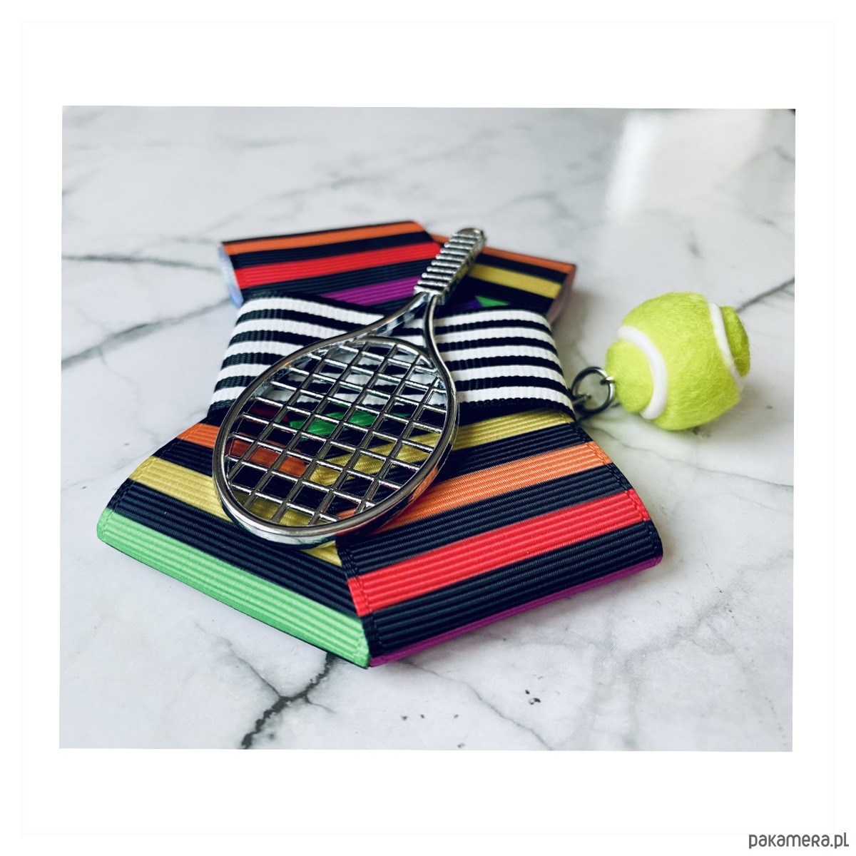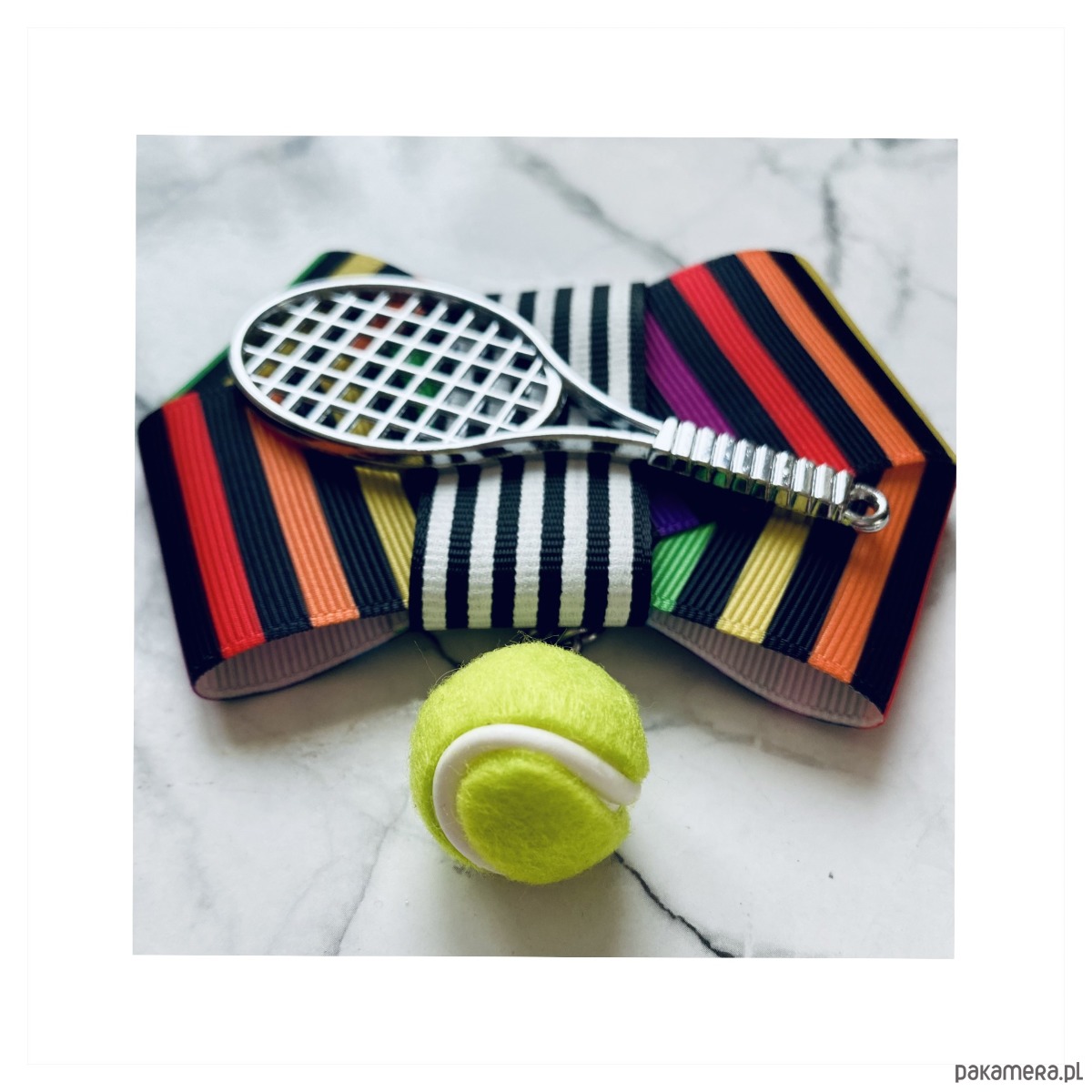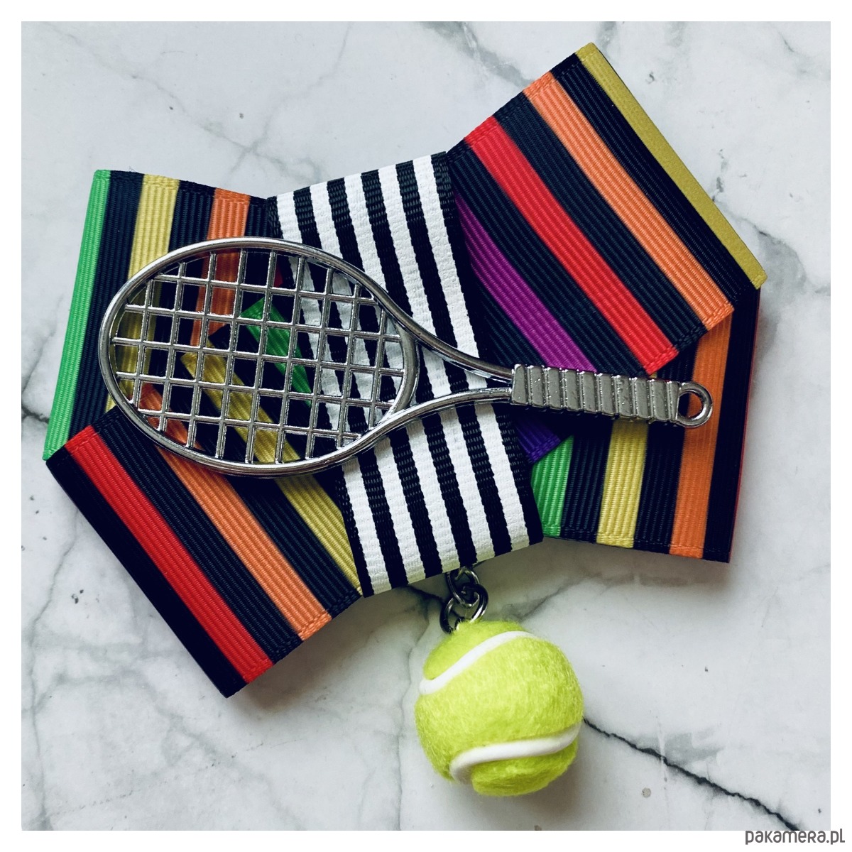 Piękna Sportowa ozdoba na środku, rakieta tenisowa wraz z wiszącą piłką.