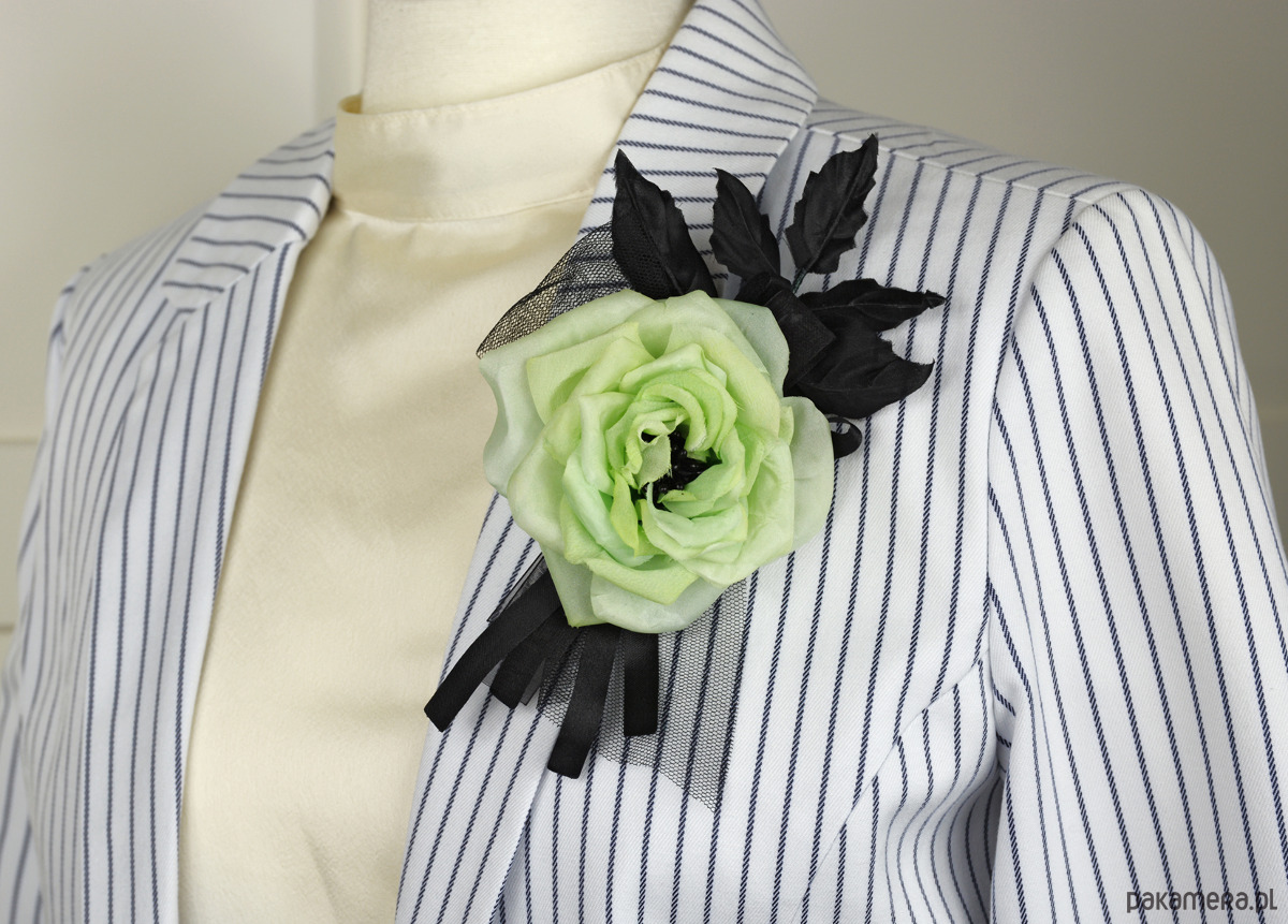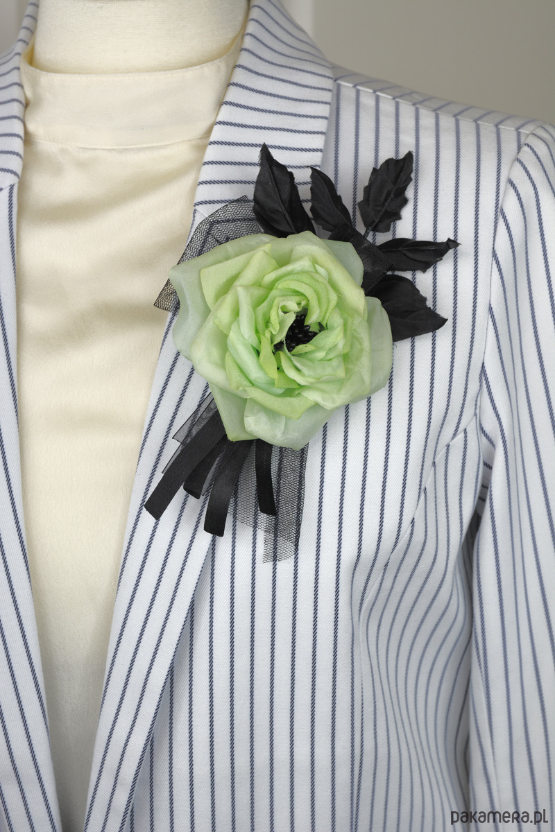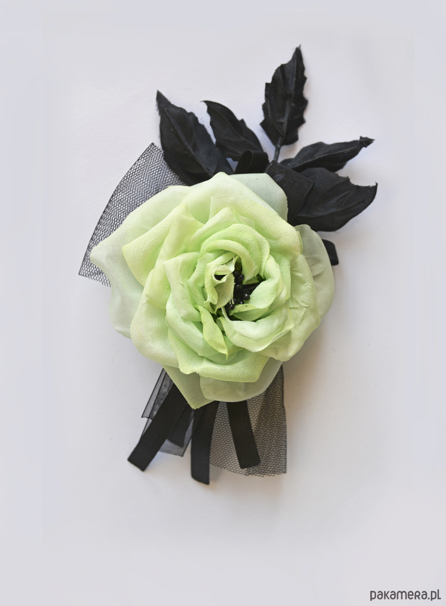 Unikatowa broszka z jedwabną rózą z listkami