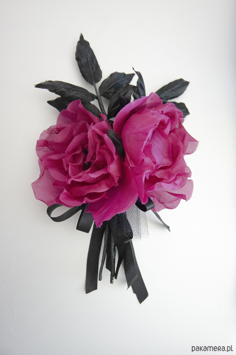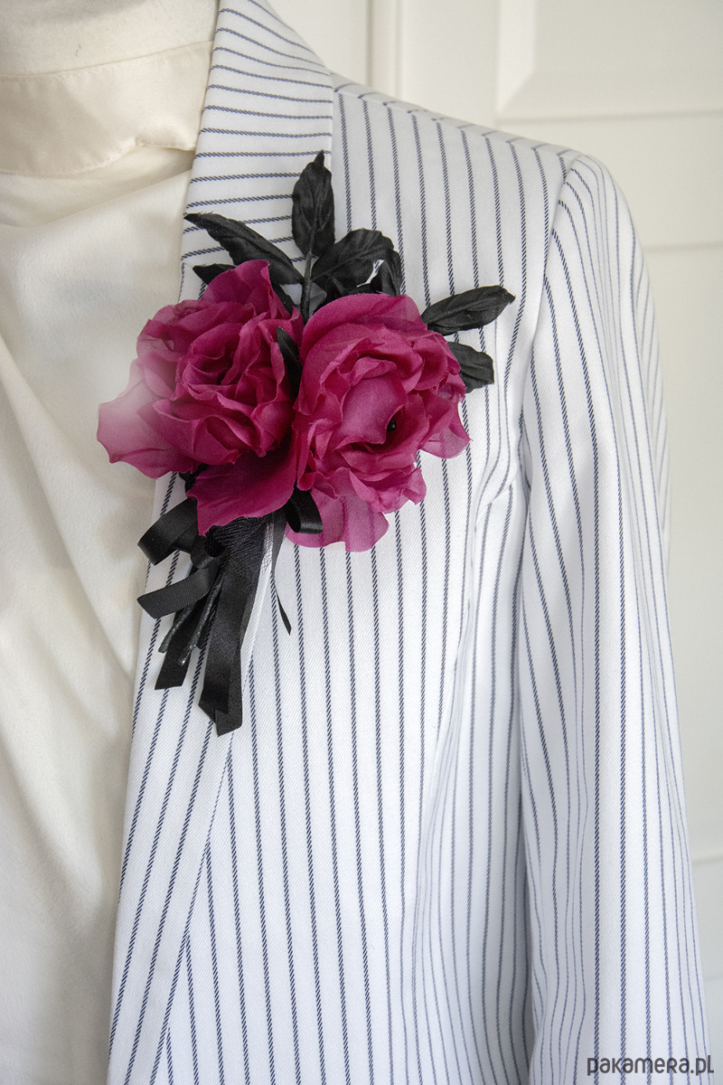 Unikatowa broszka, wykonana z ręcznie robionych kwiatów z jedwabiu.