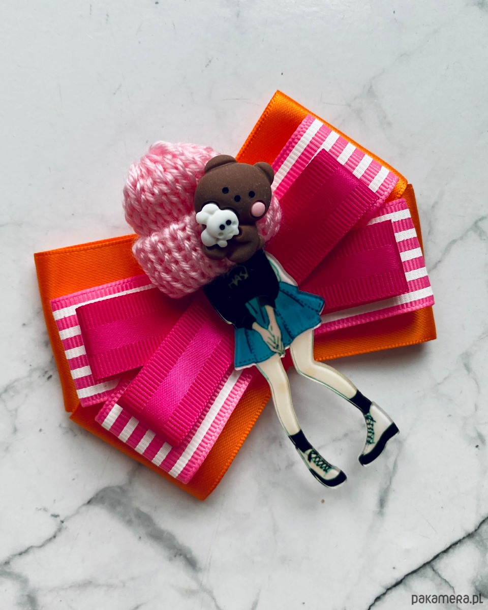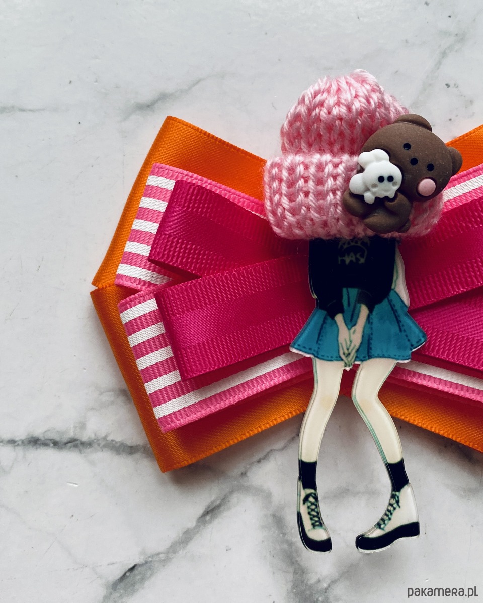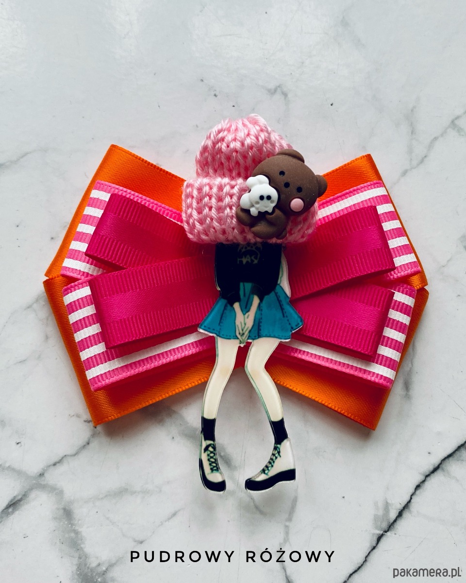 Na środku naszyta cudowna ozdoba trójwymiarowa laleczka z czapką i z misiem.