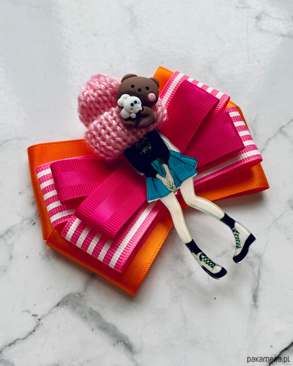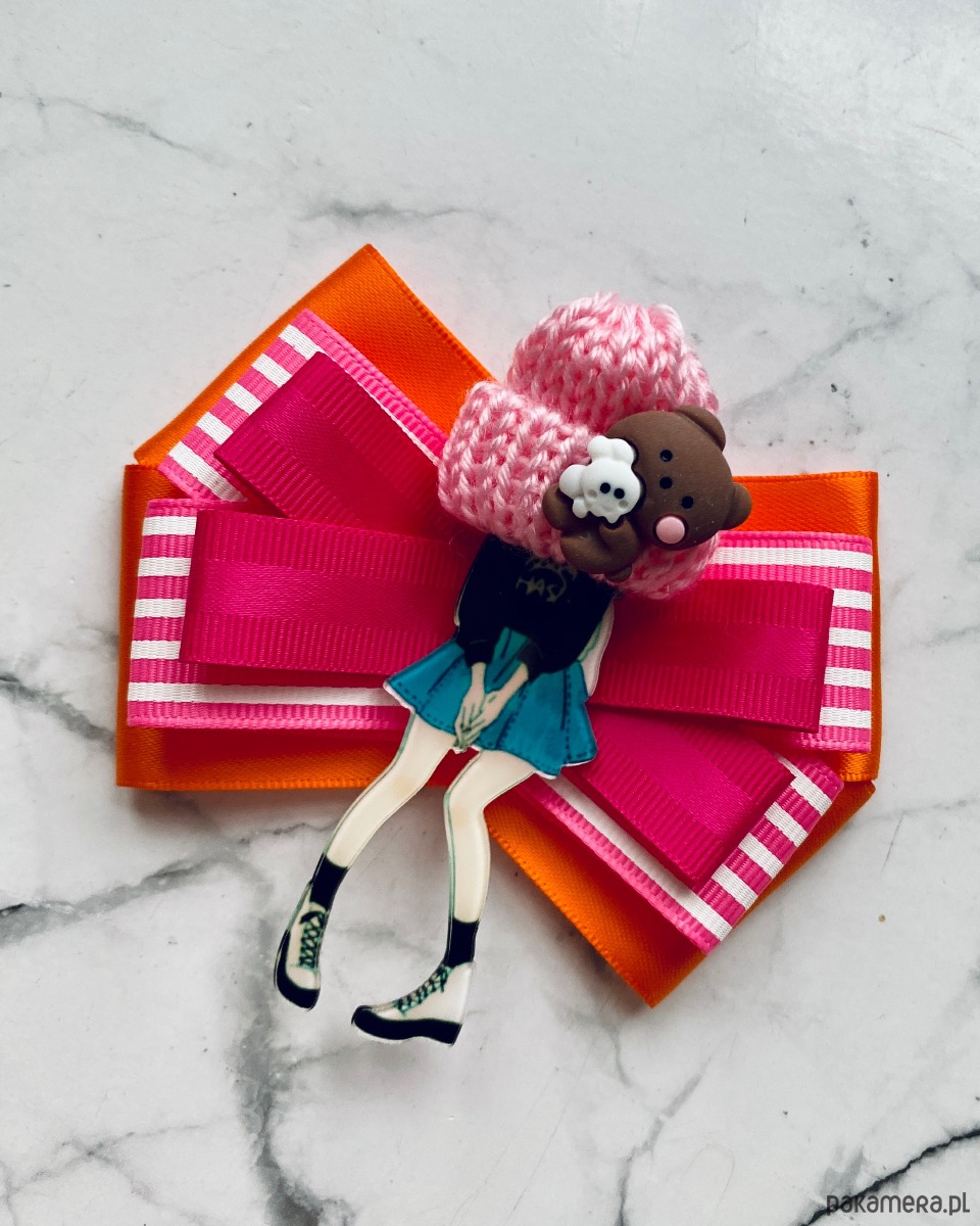 Brosza w kolorze pomarańczu, fuksji i bieli.