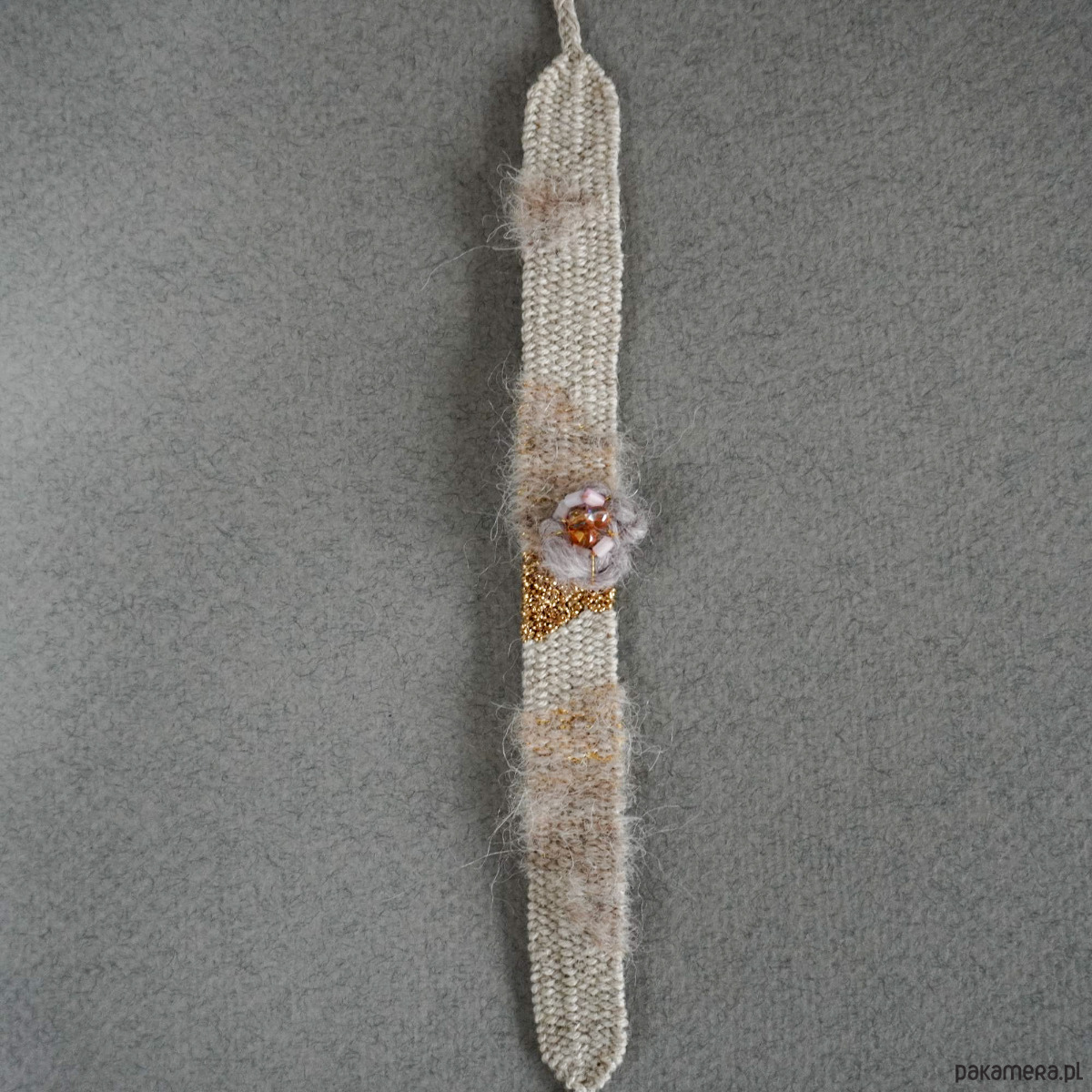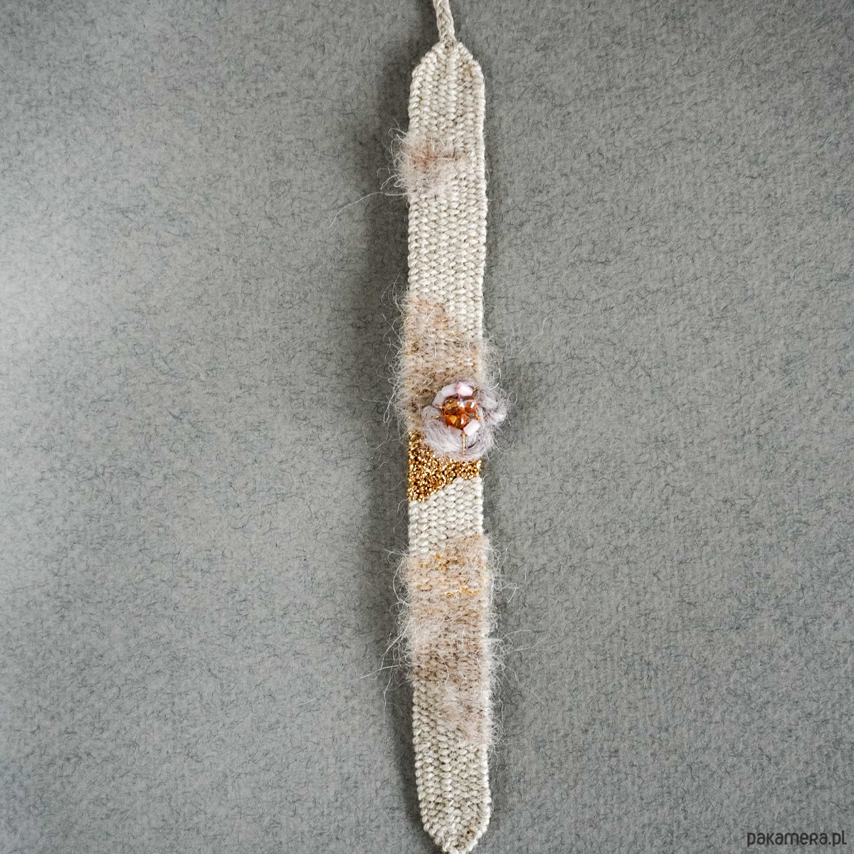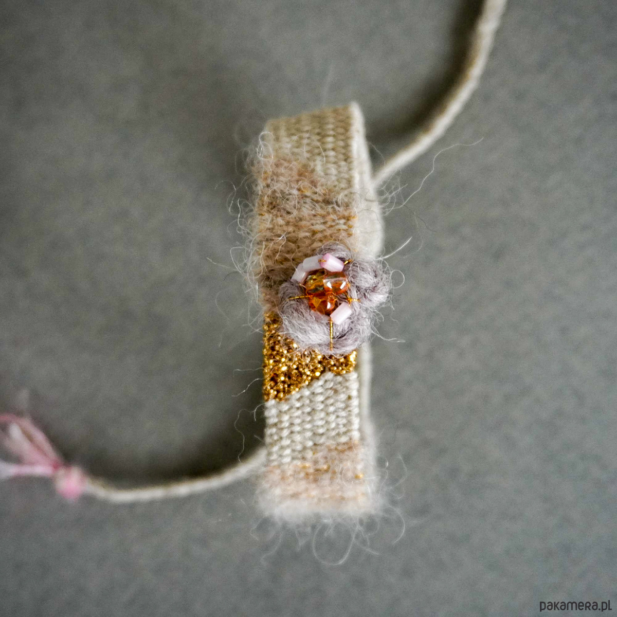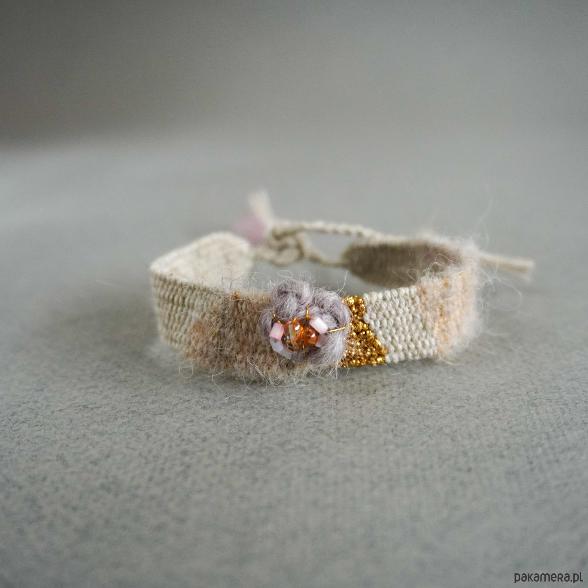 Absolutnie wyjątkowa bransoletka ręcznie wykonana na krośnie. Stonowana kolorystyka, surowość naturalnych nici czyli bawełny, lnu, wełny i jedwabiu została pięknie zbalansowana złotym błyskiem, dekoracyjnym wypukłym kwiatuszkiem/kłębuszkiem z koralikami szklanymi. Szerokość części tkanej to niecałe 1,5 cm, długość części tkanej to około 14, 15 cm. Bransoletkę wiąże się samodzielnie na supełek. Polecam gorąco♡. Bransoletki są estetycznie zapakowane, więc idealnie nadają się na prezent.