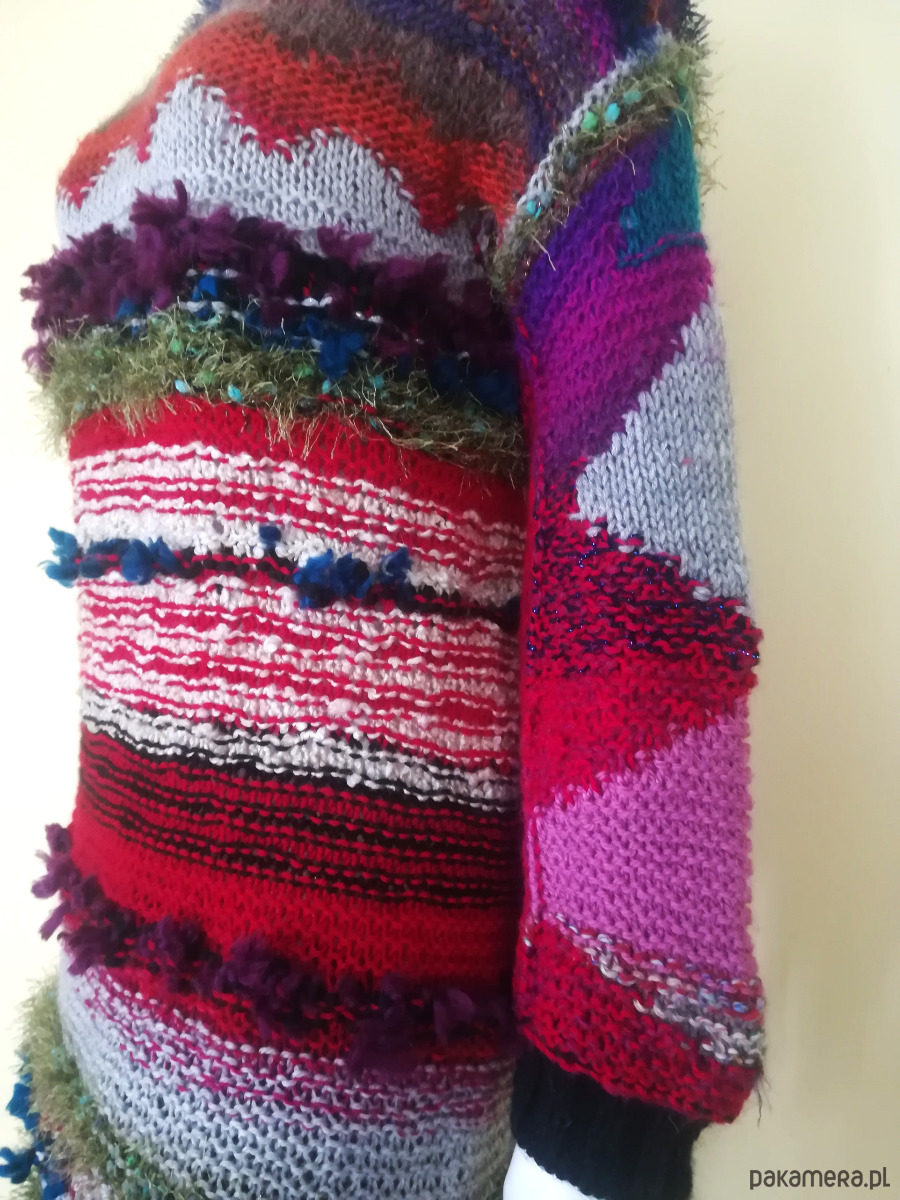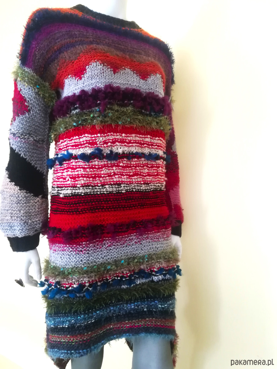 Unikatowa sukienka zrobiona ręcznie na drutach ze szlachetnych włóczek, w żywych kolorach. Miękka forma sukienki z asymetrycznym, wydłużonym tyłem , zakończonym dwoma trójkątnymi elementami różnej wielkości i krótszym ,prostym przodem. Faktura sukienki bogata , uzyskana przez różne wzory i grubości włóczek. Wzbogacona nierównościami ściegu i poszczególnych oczek .Sukienka w stylu casual. Ponadczasowa, doskonała na jesienne i zimowe dni. Doskonała na prezent dla osób oryginalnych, ceniących ubrania niepowtarzalne i szlachetne. Styl boho.