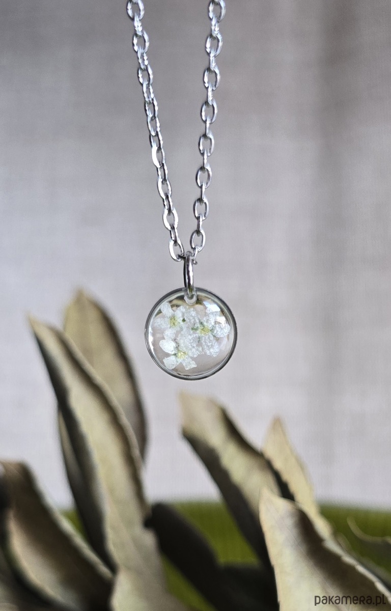Oferuję Państwu unikalną biżuterię. Zawieszka jest wykonana z suszonych kwiatów i żywicy epoksydowej. Biżuteria jest wspaniałym i oryginalnym prezentem na lata.