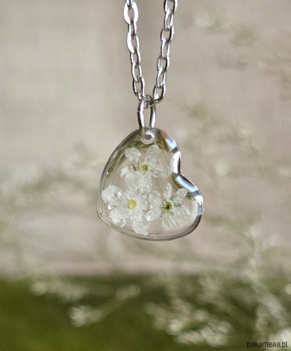 Unikatowe białe niezapominajki wisiorek zawieszka kwiaty serce serduszko