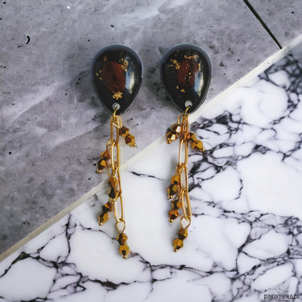 unikatowe klipsy wykonane z transparentnej czarnej żywicy oraz zatopionych w niej ziaren kawy i złotych metalicznych płatków.