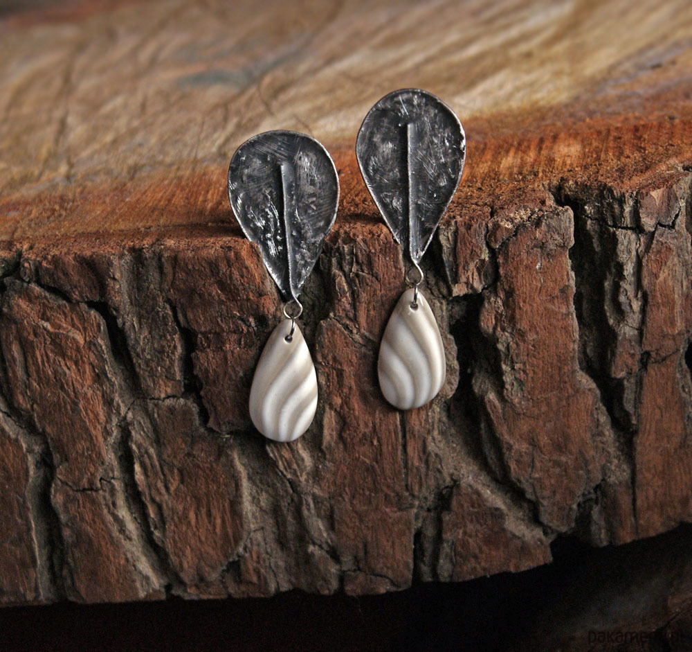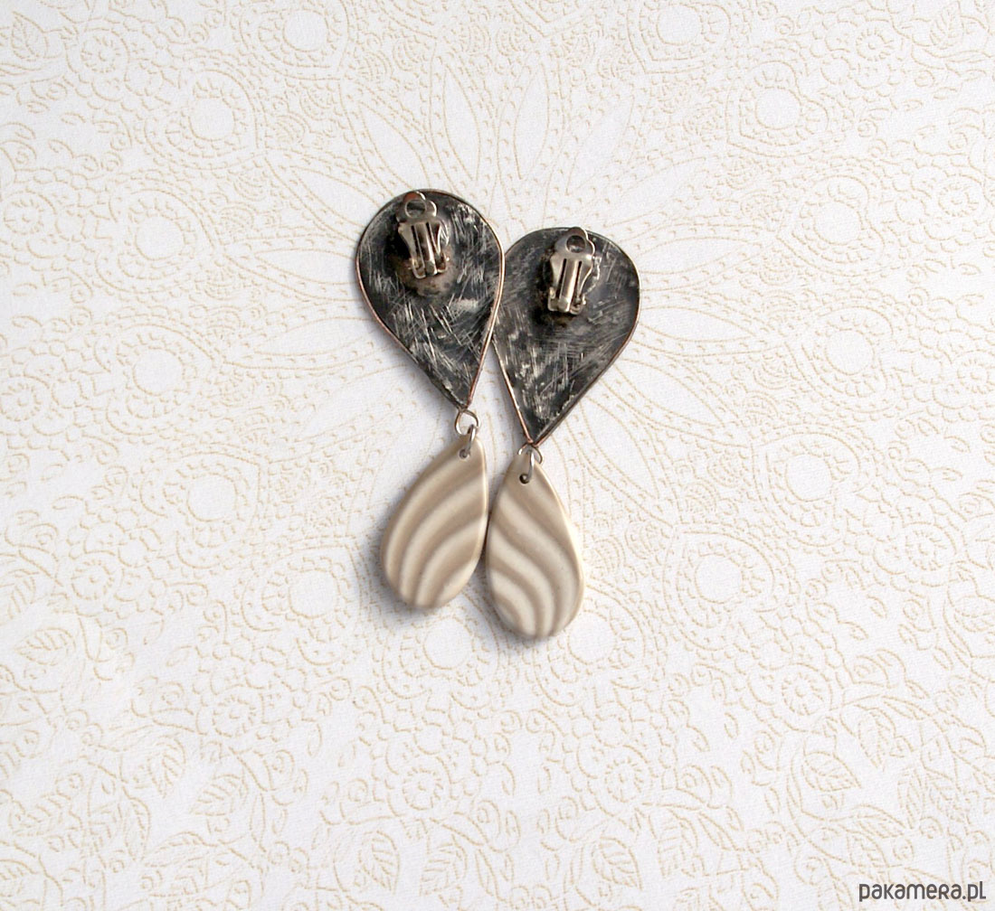 bazę tych unikatowych klipsów wykonałam starannie w technice Tiffany - jest ekstremalnie surowa - wykonana z miedzi pokrytej ekologiczną cyną (bez ołowiu). aby jeszcze bardziej podkreślić wyraźną fakturę, klipsy były patynowane (czernione) i przecierane.