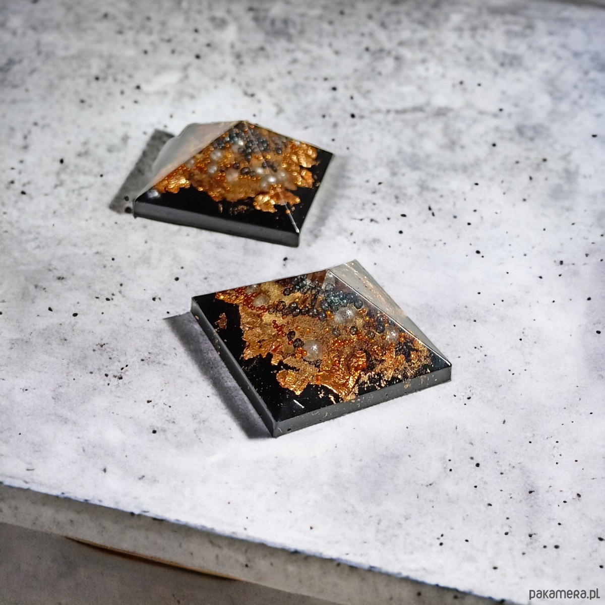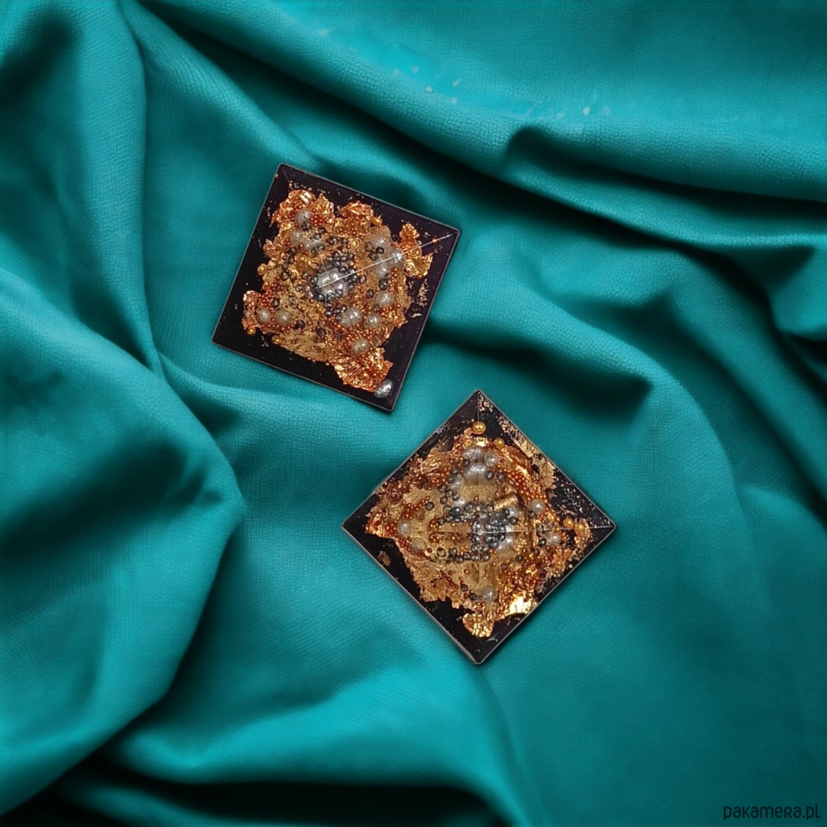 zjawiskowe KLIPSY wykonane z transparentnej i czarnej żywicy oraz mnóstwa zatopionych w niej dodatków (złote płatki szlagmetalu, szklany kawior)