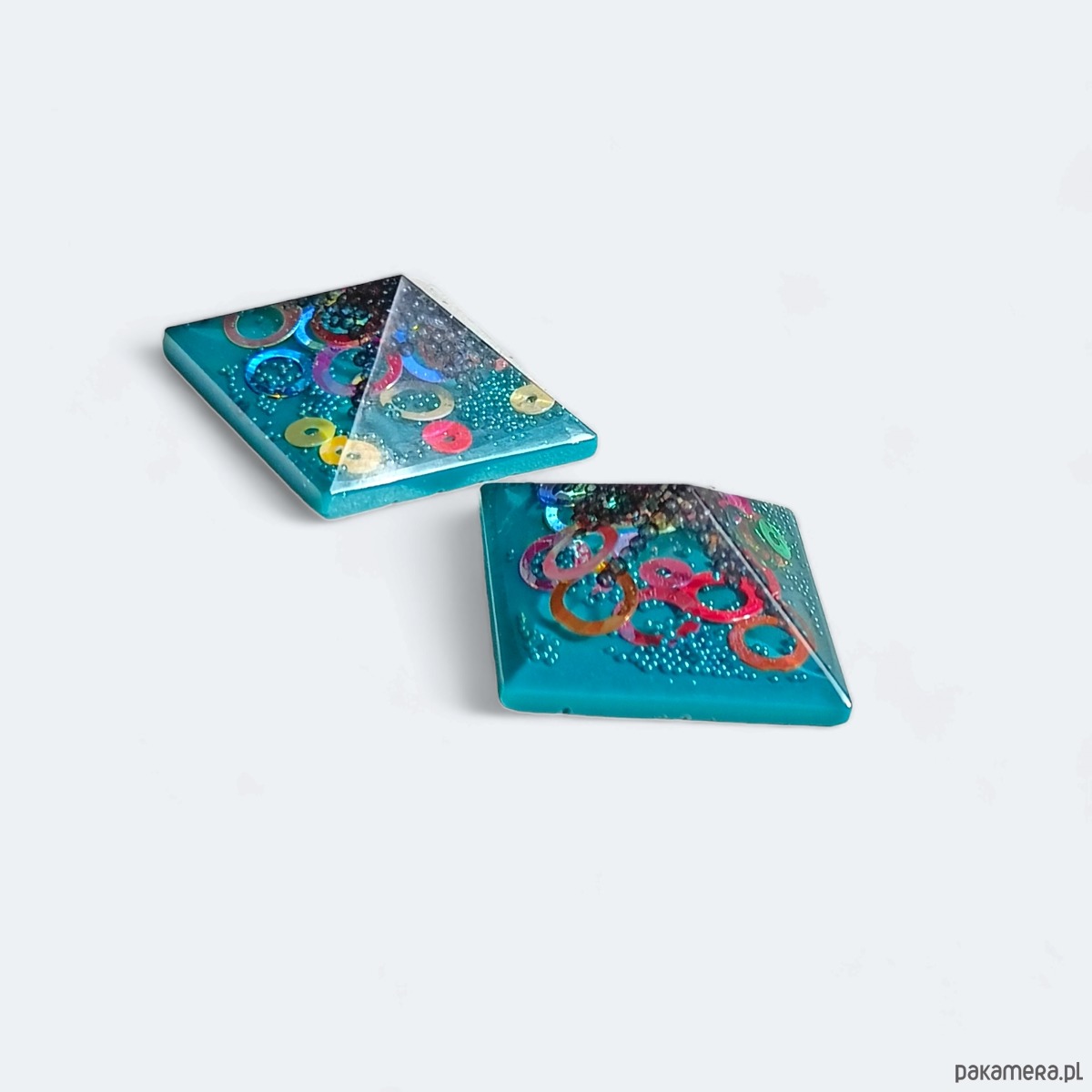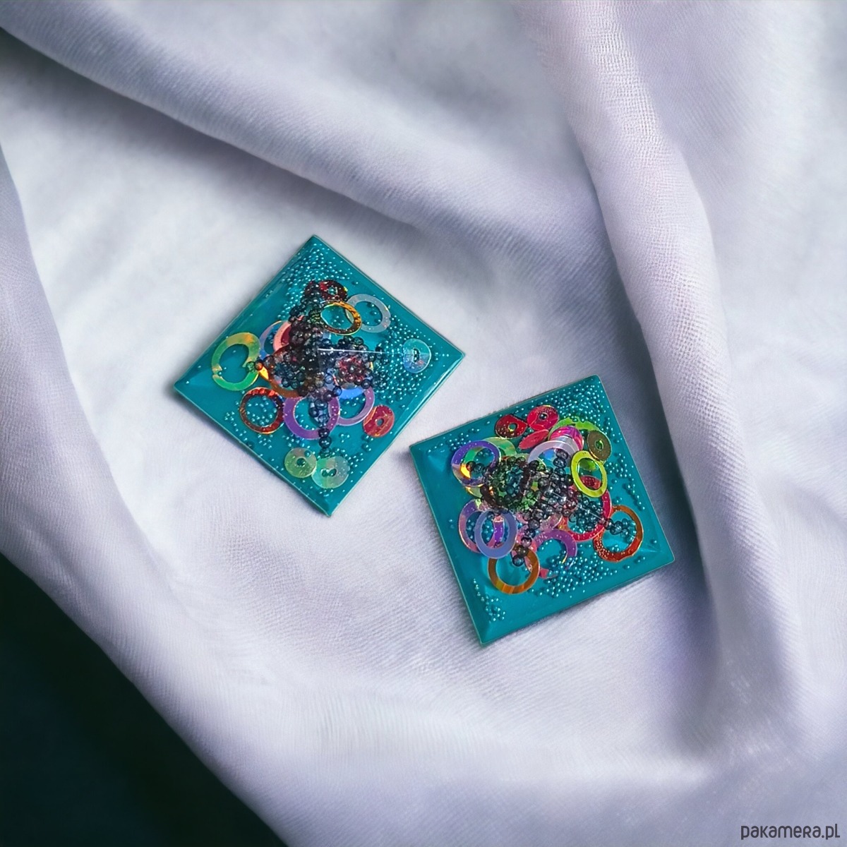zjawiskowe KLIPSY wykonane z transparentnej i turkusowej żywicy oraz całego mnóstwa zatopionych w niej dodatków: cekinowych kółeczek i szklanego kawioru.