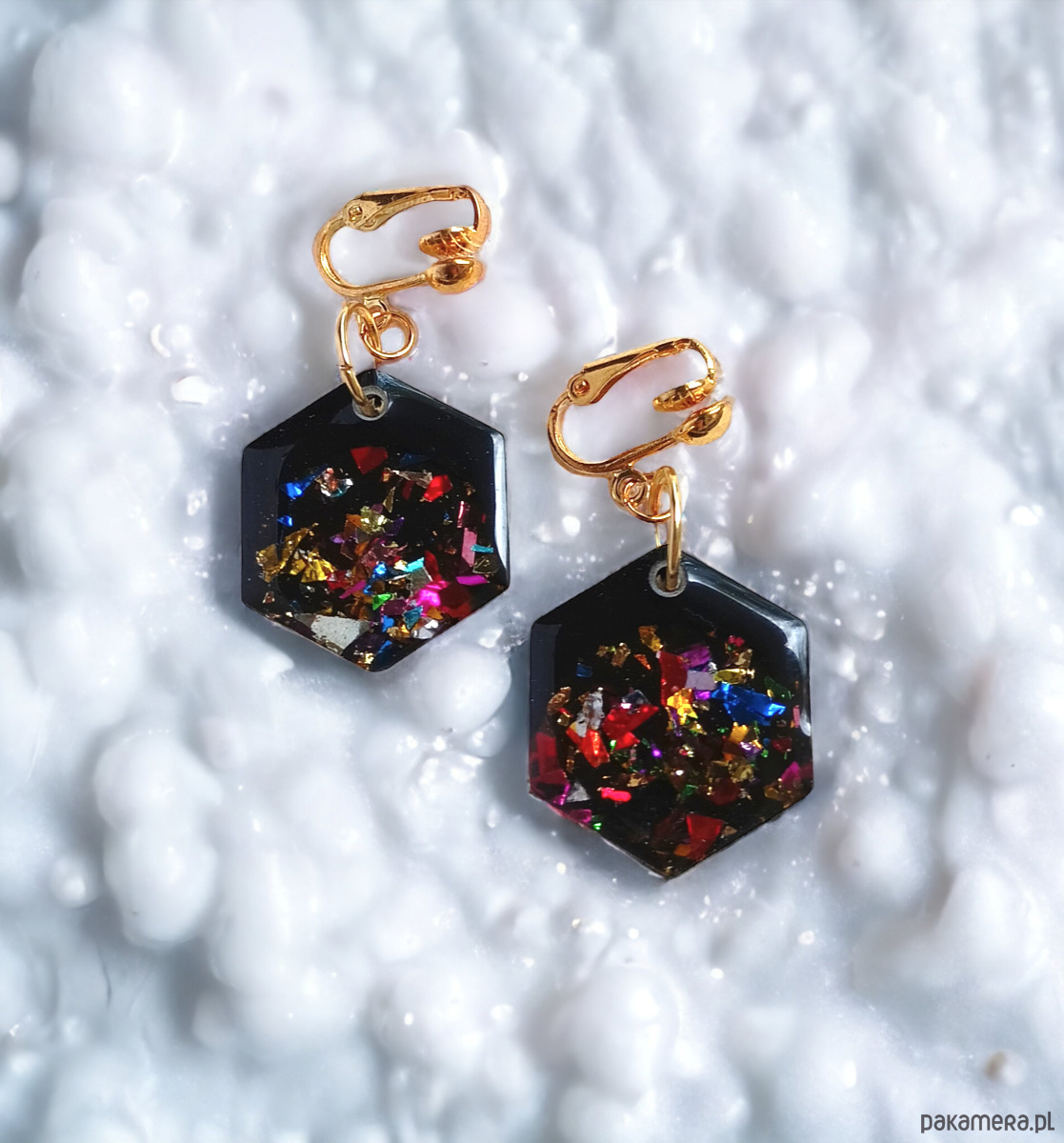 unikatowe klipsy wykonane z transparentnej i czarnej żywicy z dodatkiem cząsteczek wielobarwnej, błyszczącej folii.