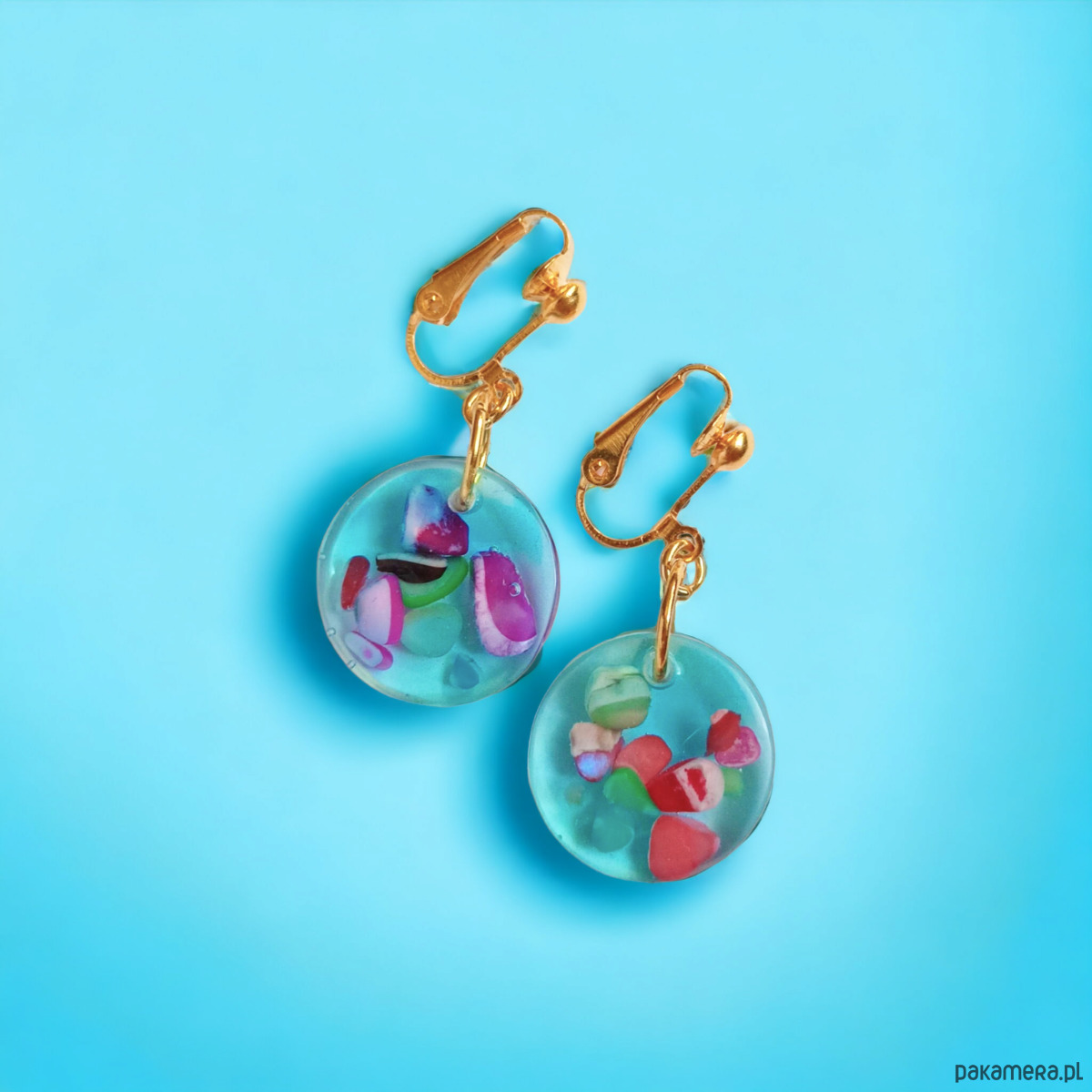 unikatowe klipsy wykonane z transparentnej żywicy w odcieniach jasnego turkusu oraz zatopionych w niej nieregularnych cząstek wielobarwnej masy perłowej. kolorowe elementy wyglądają, jakby unosiły się na powierzchni wody.