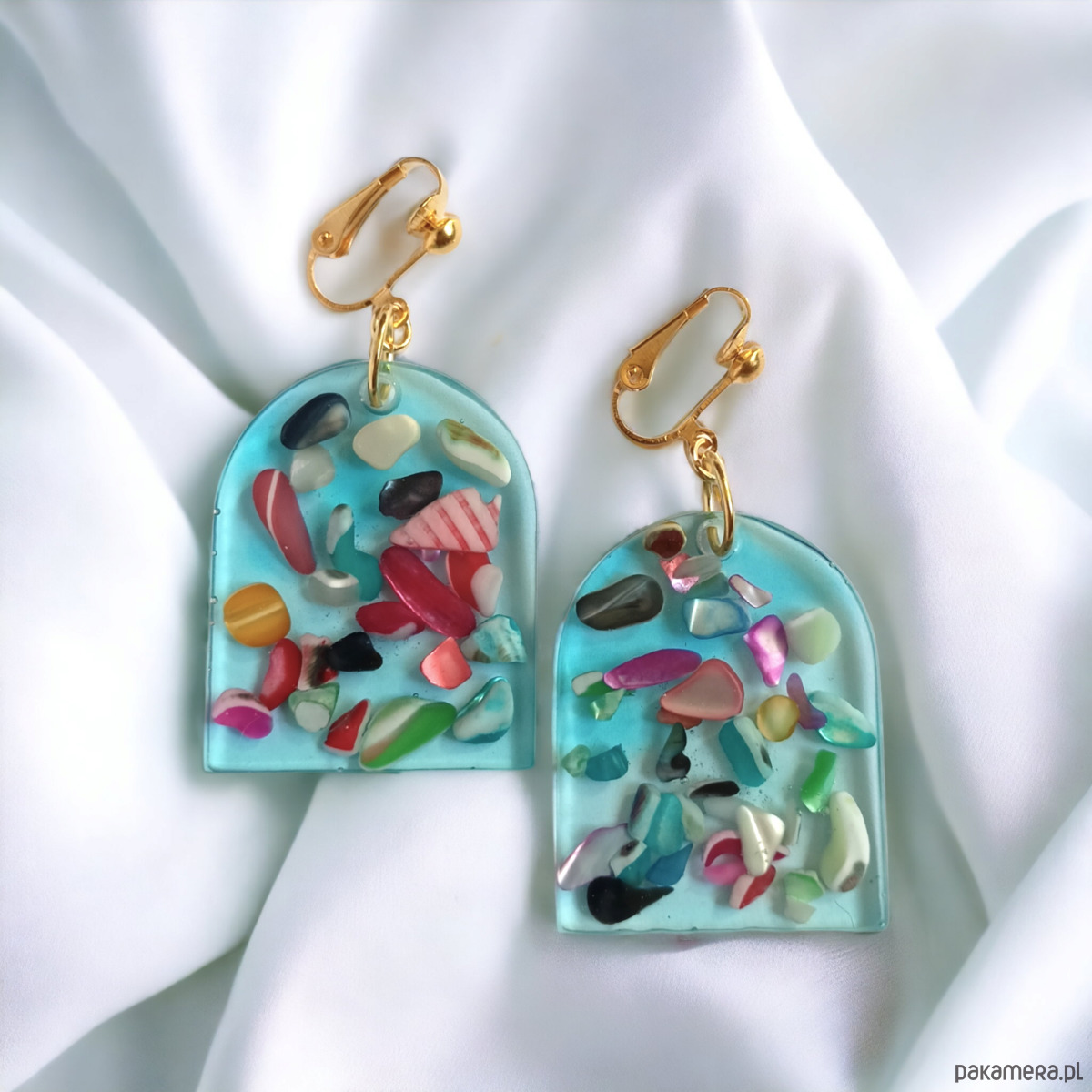 unikatowe klipsy wykonane z transparentnej żywicy w odcieniach jasnego turkusu oraz zatopionych w niej nieregularnych cząstek wielobarwnej masy perłowej. kolorowe elementy wyglądają, jakby unosiły się na powierzchni wody.