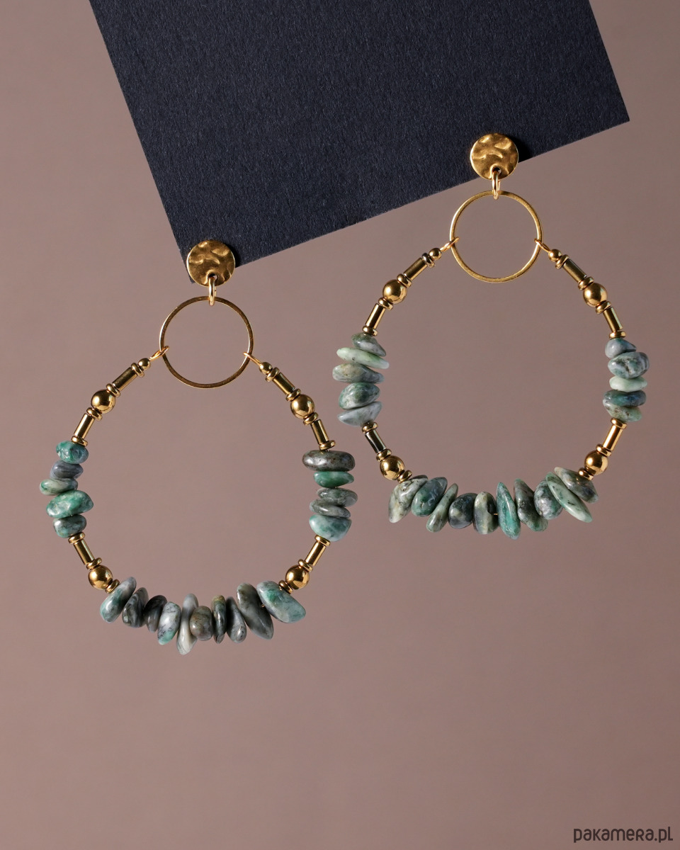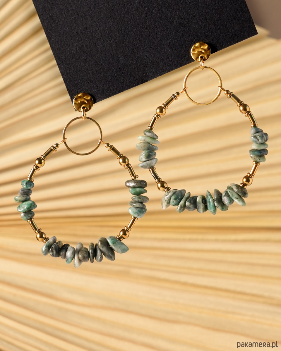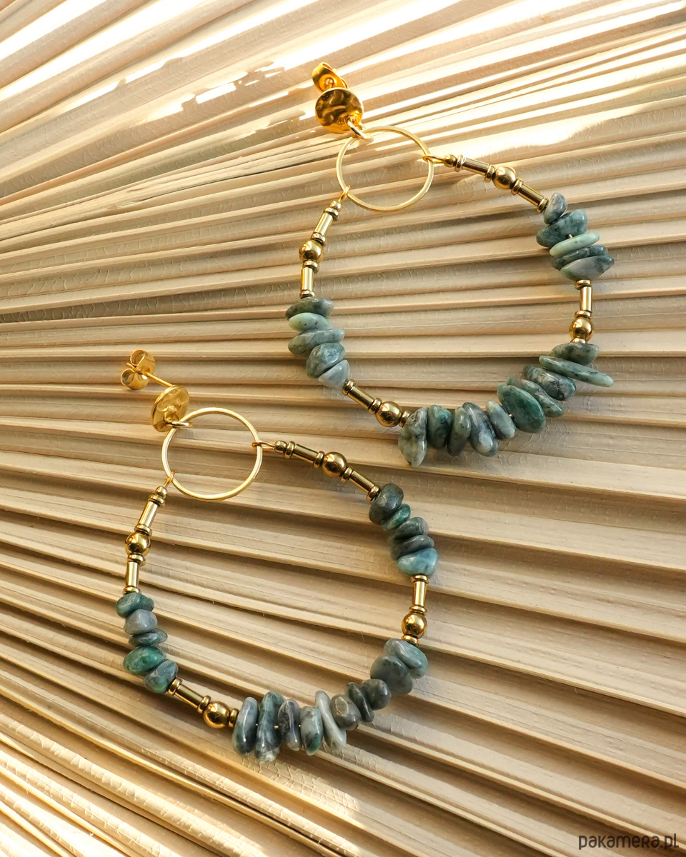 Unikatowe i bardzo efektowne kolczyki boho wykonane z TURKUSA AFRYKAŃSKIEGO (rodzaj JASPISU) o nieregularnych kształtach oraz złotego HEMATYTU. Całość jest zawieszona na oryginalnych sztyftach z okrągłą blaszką o nieregularnej fakturze. Wszystkie metalowe elementy to STAL SZLACHETNA w kolorze złotym.