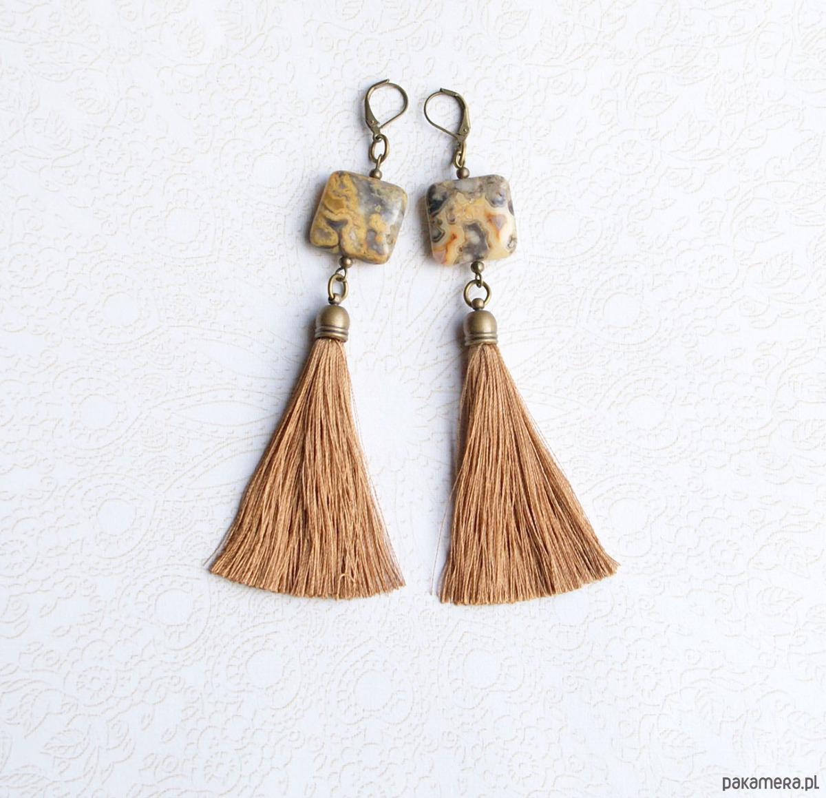 wykonane z elementów metalowych w kolorze ant. złota, dużych pastylek AGATU crazy lace (20mm), chwostów w czapeczkach.