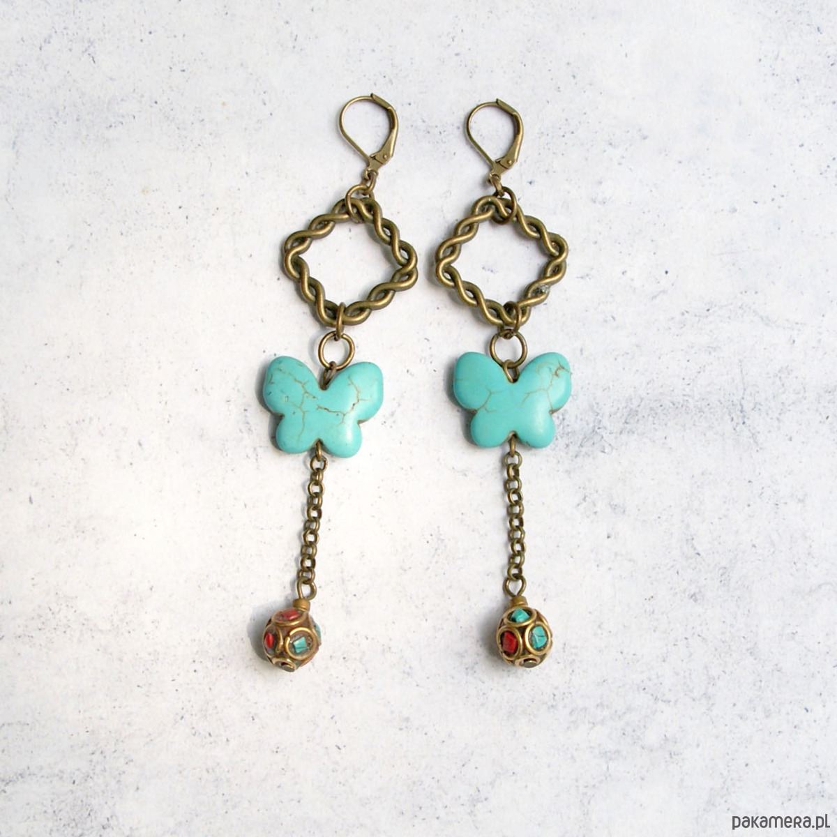 wykonane z dużych, turkusowych motyli ( howlit ), RĘCZNIE WYKONANYCH korali tybetańskich z inkrustowanym koralem i turkusem) ; okazałych zawieszek oraz innych elementów w kolorze antycznego złota - zawieszonych na bezpiecznych, zamkniętych biglach "angielskich" ...
