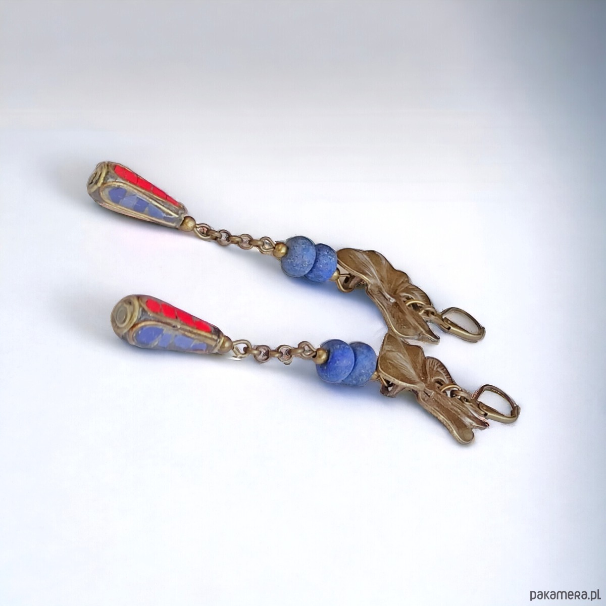 wykonane z RĘCZNIE WYKONANYCH korali tybetańskich z inkrustowanym koralem i lapis lazuli) , matowych oponek lapisu, okazałych zawieszek oraz innych elementów w kolorze antycznego złota - zawieszonych na bezpiecznych, zamkniętych biglach "angielskich" ...