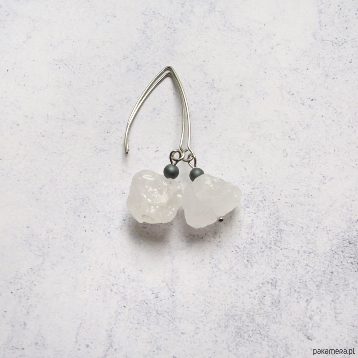 długie, ozdobne bigle - rybki, nieregularne bryły kryształu górskiego.