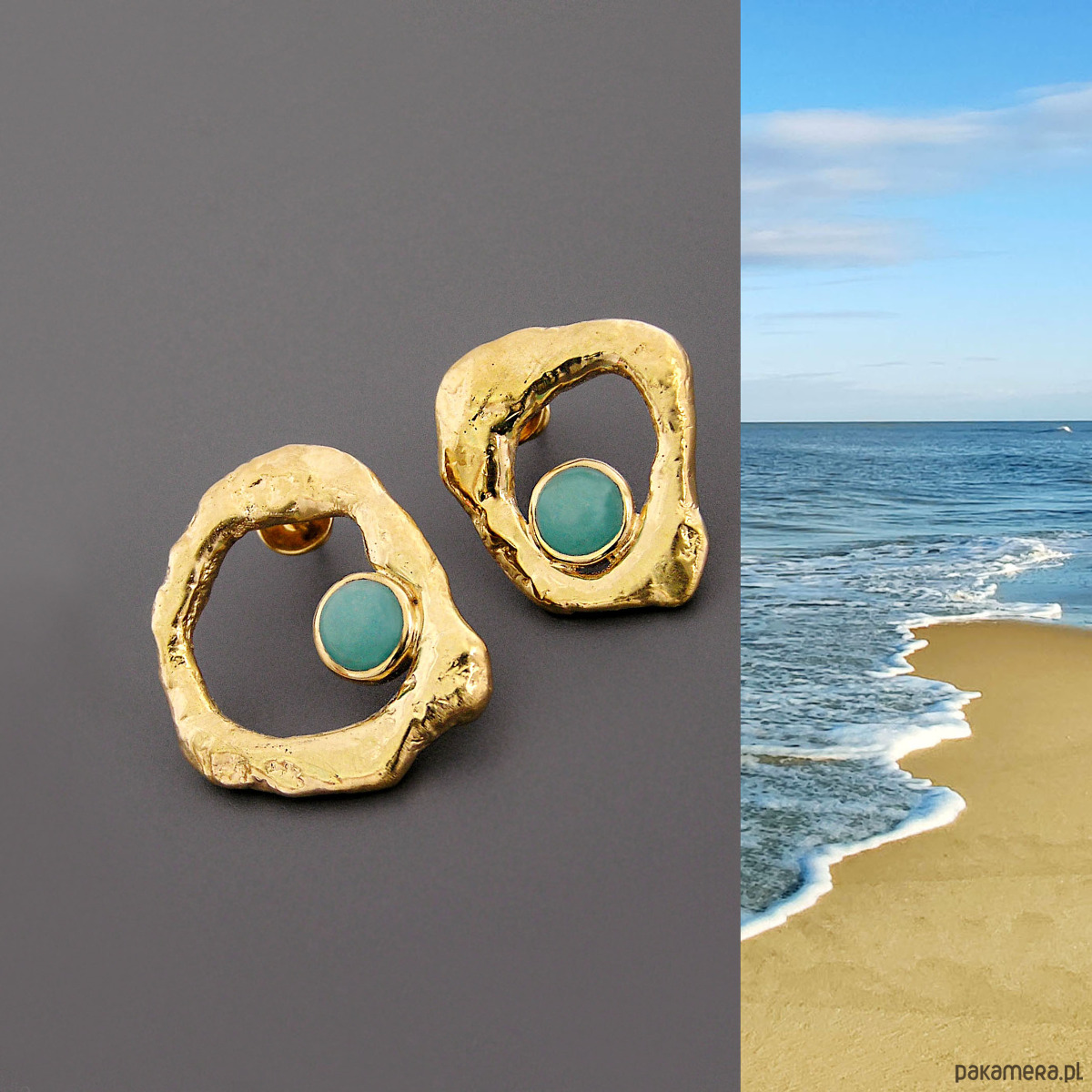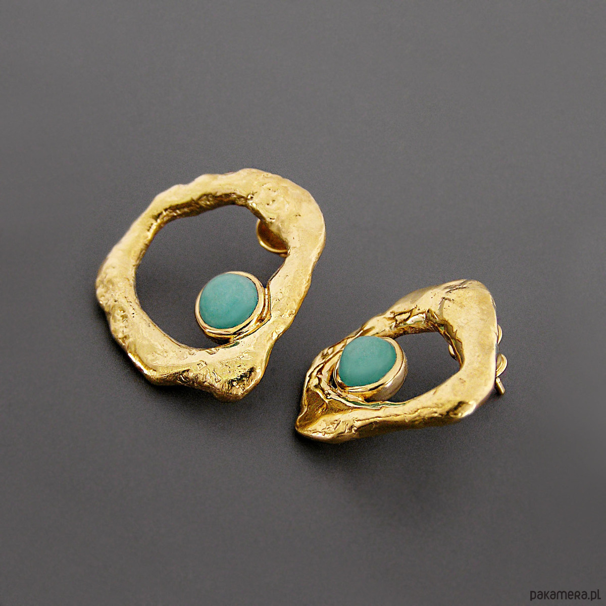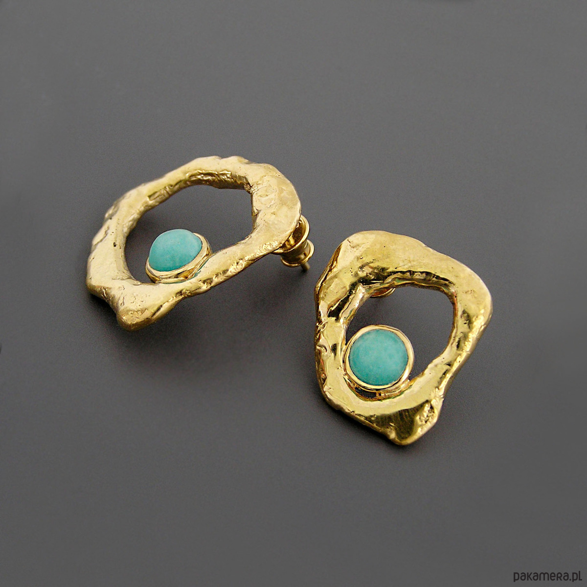Unikatowe kolczyki z amazonitami wykonane z fuzowanego srebra 925, złocone warstwą 2 mikronów 24 karatowego złota.