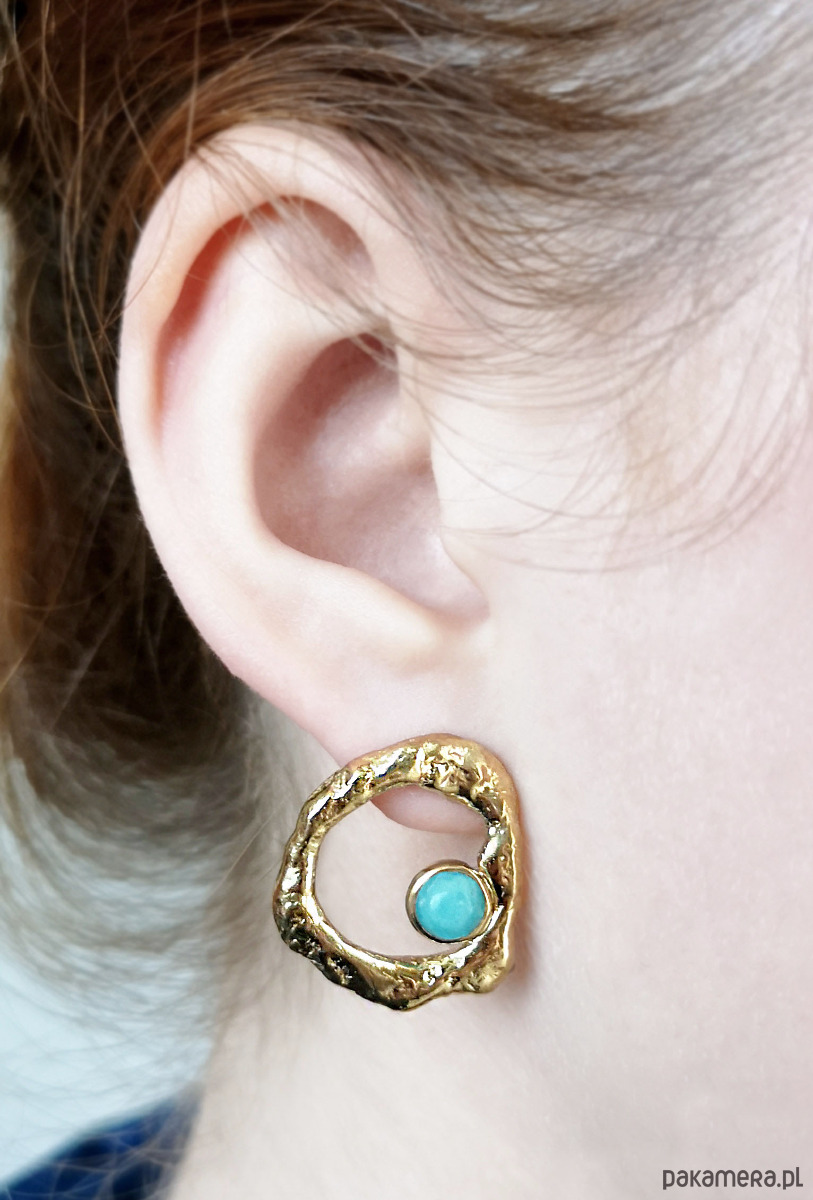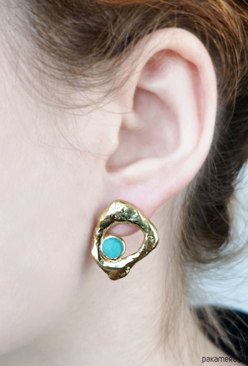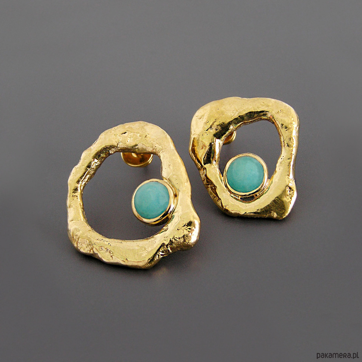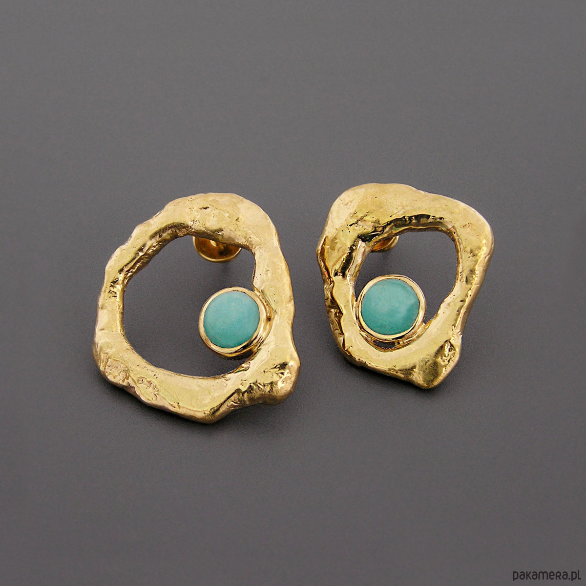 Unikatowe kolczyki z amazonitami wykonane z fuzowanego srebra 925, złocone warstwą 2 mikronów 24 karatowego złota.