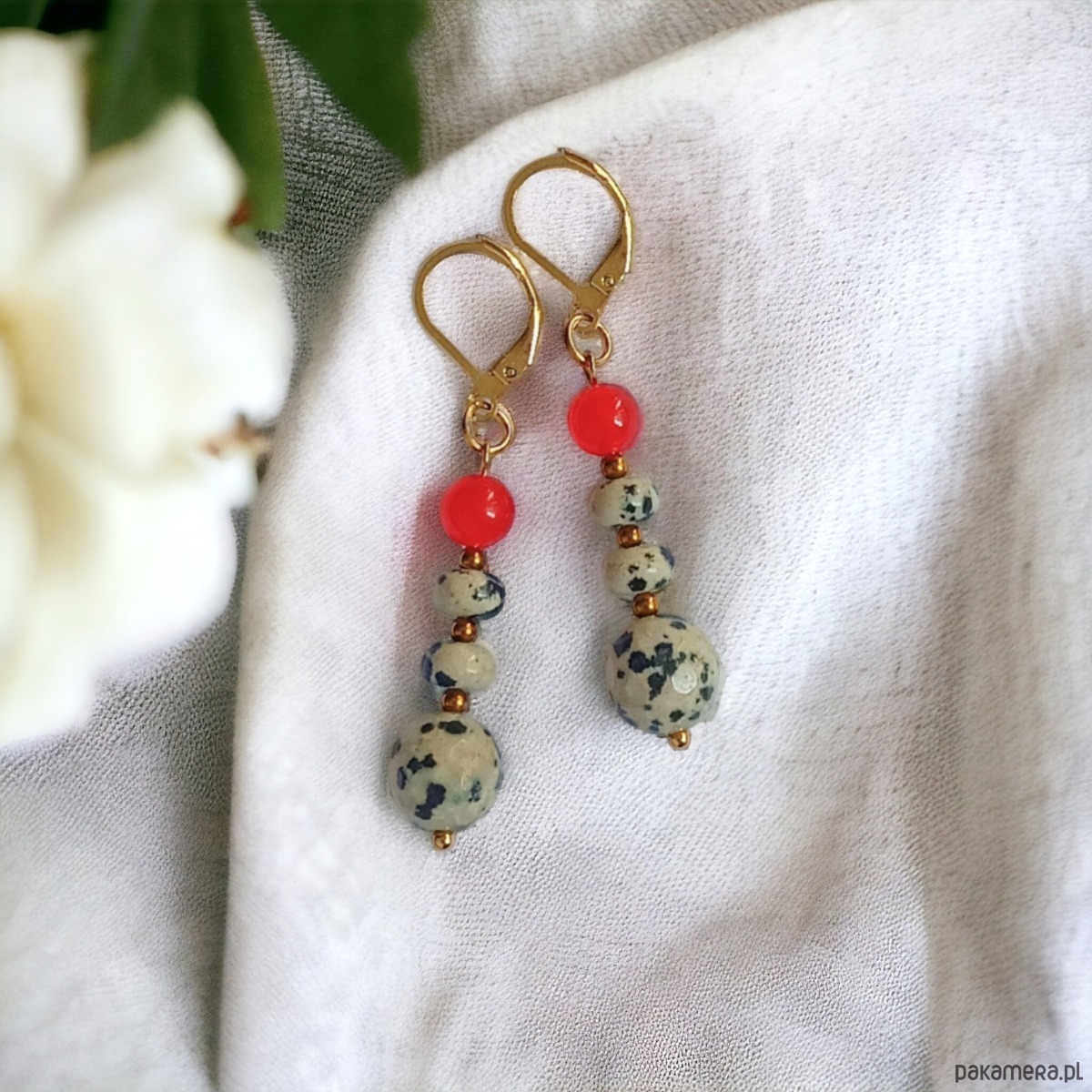 Kolczyki zostały wykonane z oponek i fasetowanej kuli (11mm) jaspisu dalmatyńskiego, przekładek ze złotego hematytu oraz kontrastujących kul jadeitu w soczystym odcieniu czerwieni (6mm)