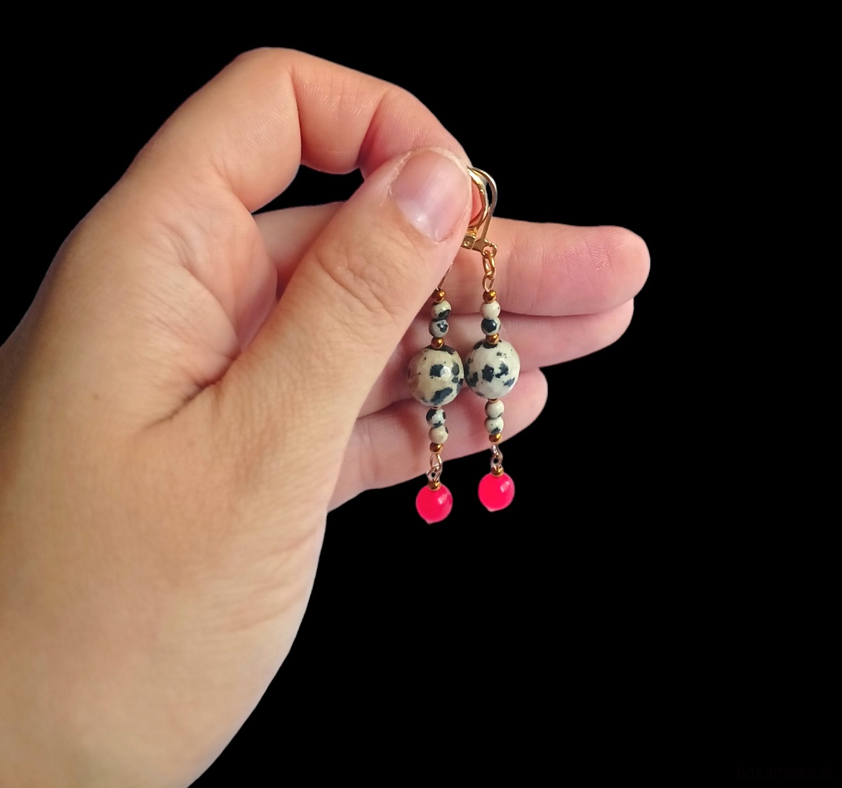 Kolczyki zostały wykonane z kuleczek 3mm i fasetowanej kuli (11mm) jaspisu dalmatyńskiego, przekładek ze złotego hematytu oraz kontrastujących kul jadeitu w soczystym odcieniu czerwieni (6mm)