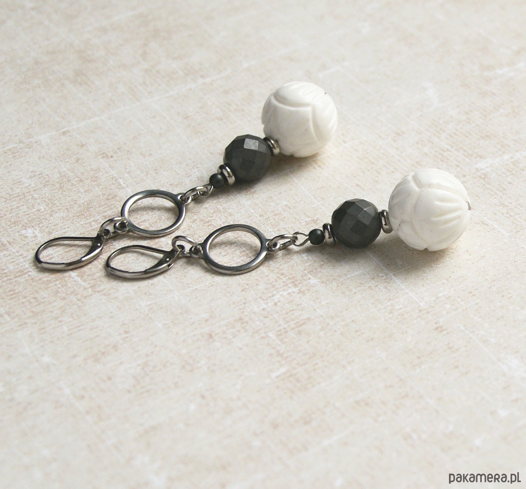 UNIKATOWE , niezwykle efektowne kolczyki, wykonane z wysokiej jakości materiałów: wszystkie elementy metalowe wykonane ze STALI SZLACHETNEJ (nie uczula, kolor nie ściera się)-bezpieczne, zapinane bigle angielskie, końcówki, przekładki; RZEŹBIONA MUSZLA 14mm, fasetowany, matowy hematyt