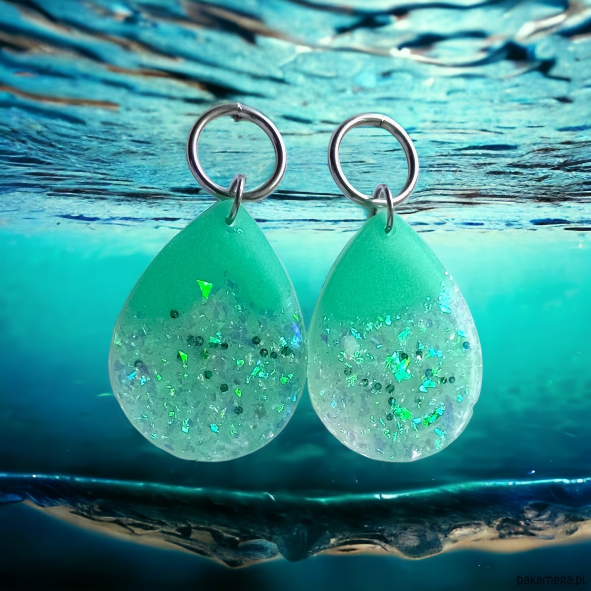 wykonane z własnoręcznie zrobionych elementów z MIĘTOWEJ - perłowej i transparentnej żywicy z zatopionymi drobinkami (efekt tłuczonego szkła, kolor - efekt holo syrenki;)