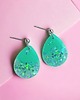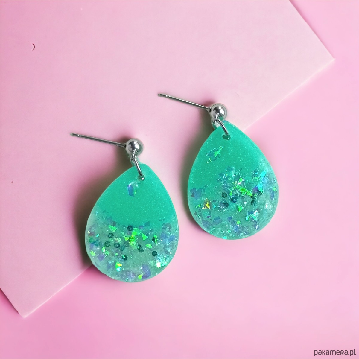 wykonane z własnoręcznie zrobionych elementów z MIĘTOWEJ - perłowej i transparentnej żywicy z zatopionymi drobinkami (efekt tłuczonego szkła, kolor - efekt holo syrenki;)