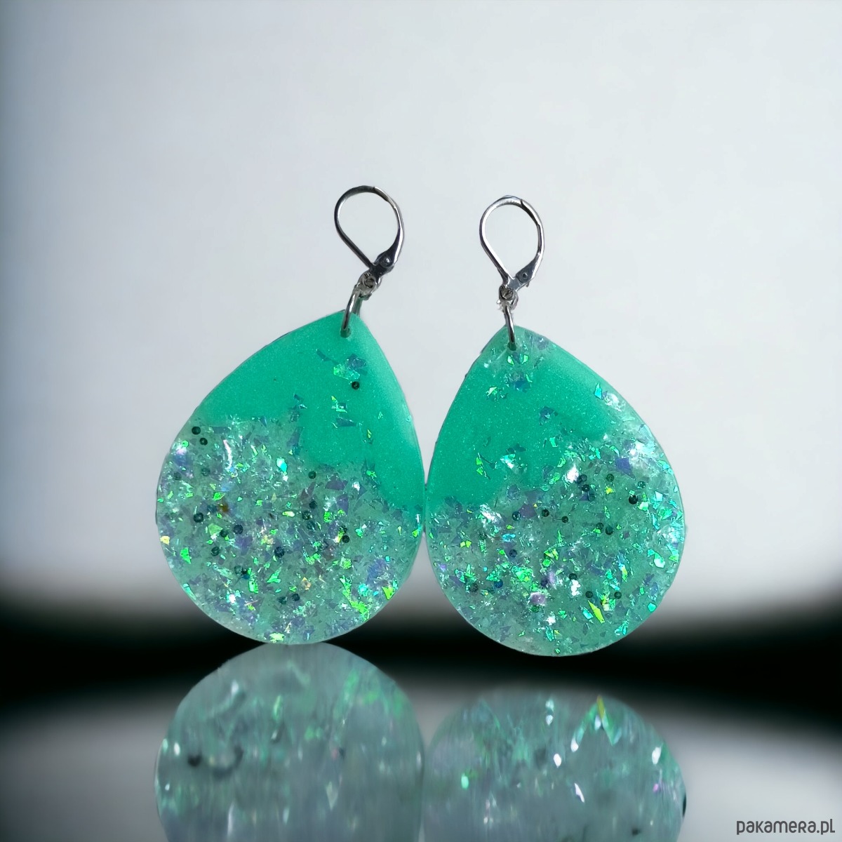 wykonane z własnoręcznie zrobionych elementów z MIĘTOWEJ - perłowej i transparentnej żywicy z zatopionymi drobinkami (efekt tłuczonego szkła, kolor - efekt holo syrenki;)