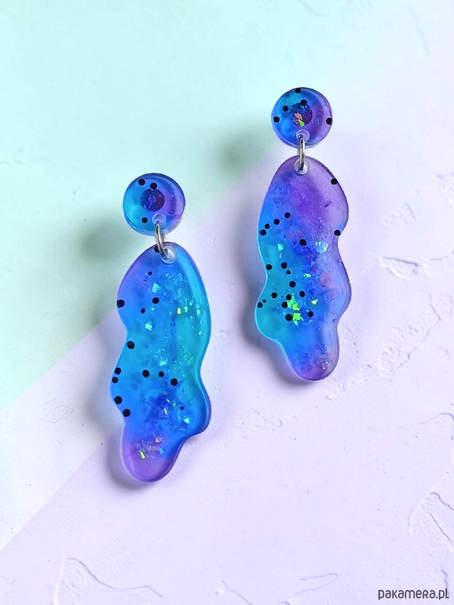 wykonane z własnoręcznie zrobionych elementów z transparentnej, turkusowej, fioletowej i chabrowej żywicy z zatopioną wewnątrz ciętą folią holograficzną - efekt holo syrenki;) oraz czarnego szklanego kawioru.