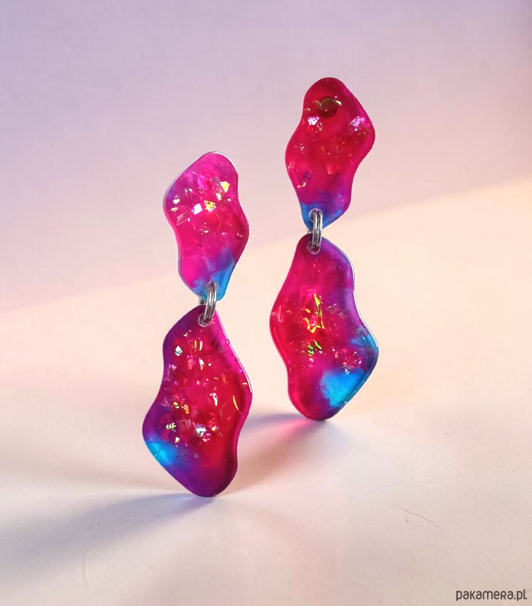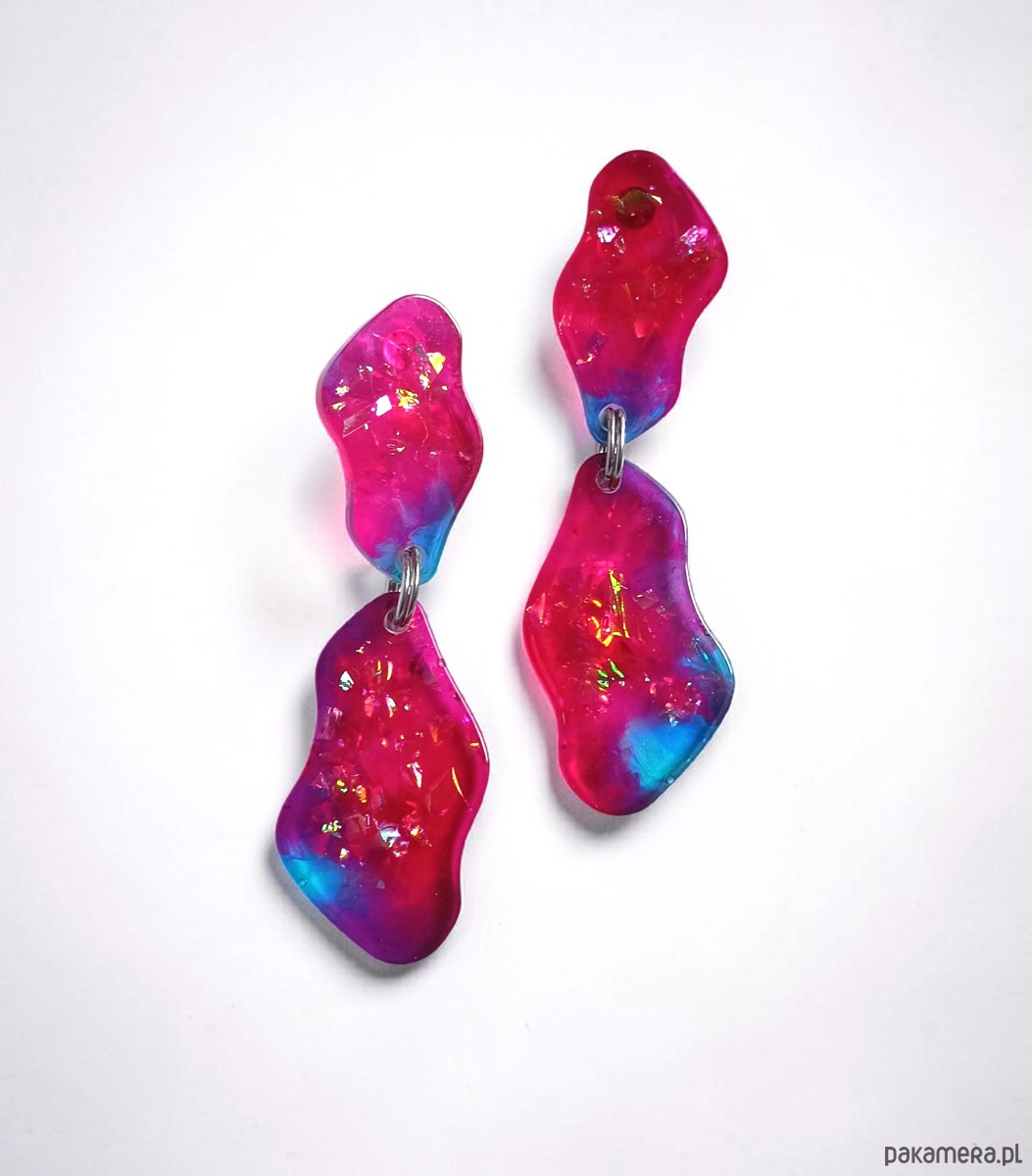 wykonane z własnoręcznie zrobionych elementów z transparentnej turkusowej i malinowej żywicy z zatopioną wewnątrz ciętą folią holograficzną - efekt holo syrenki;)