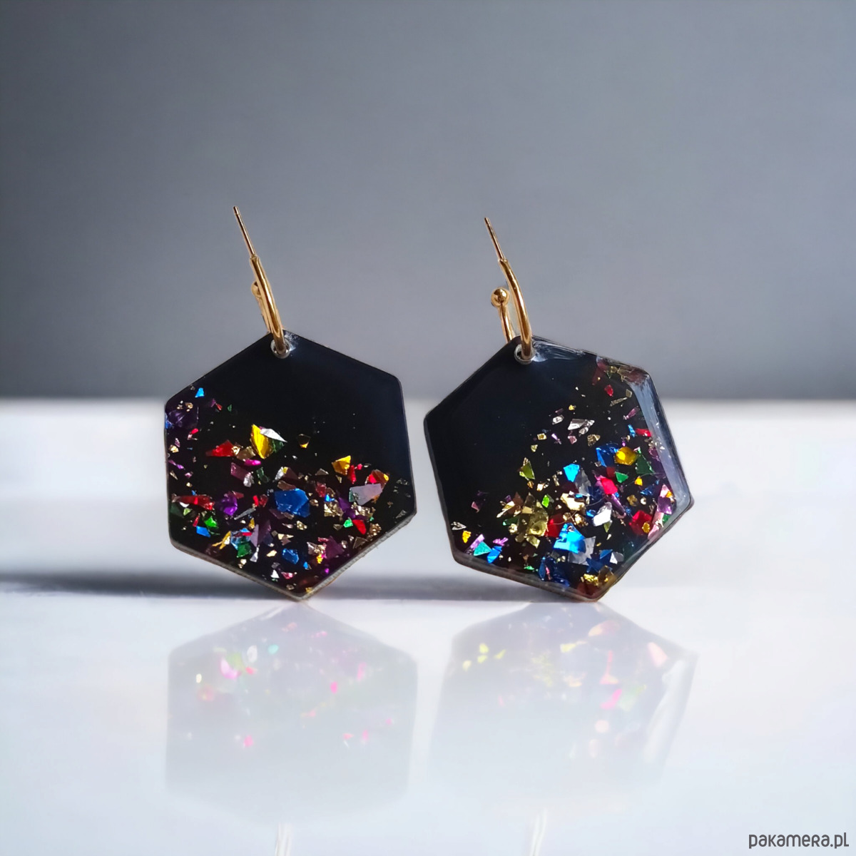 unikatowe kolczyki wykonane z transparentnej i czarnej żywicy z dodatkiem cząsteczek wielobarwnej, błyszczącej folii.